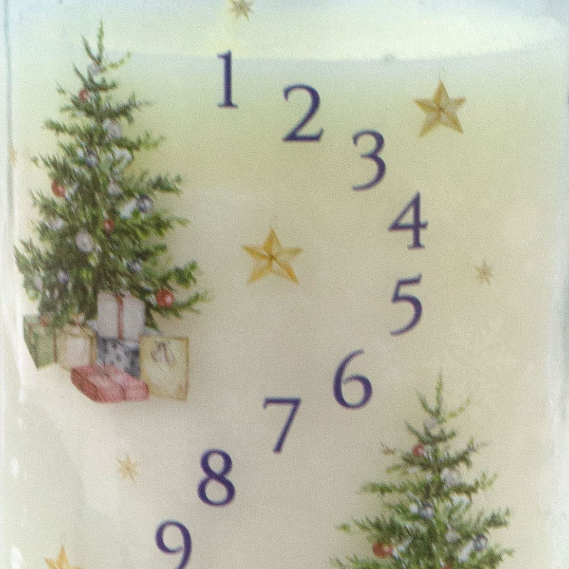 DIMENSIONS | Standing at 21cm tall, this pillar candle is the perfect size for a prominent display. Adorned with holly sprigs and Christmas-themed ornaments, this Advent candle creates a striking centrepiece for your festive table