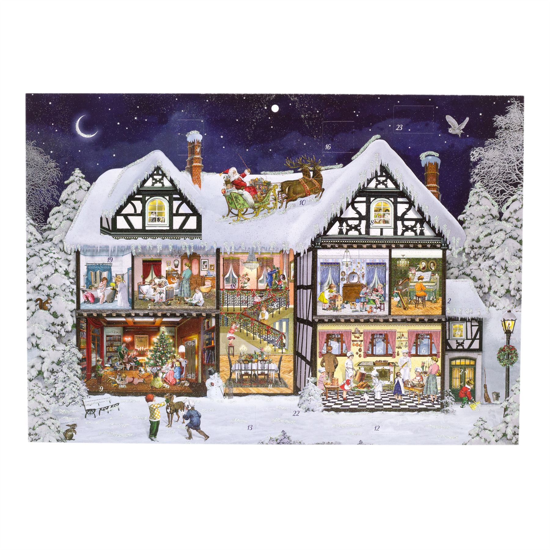 Bring the warmth of Christmas home with this A3 Advent calendar - 24 glittering doors revealing scenes of festive joy inside a snowy holiday home