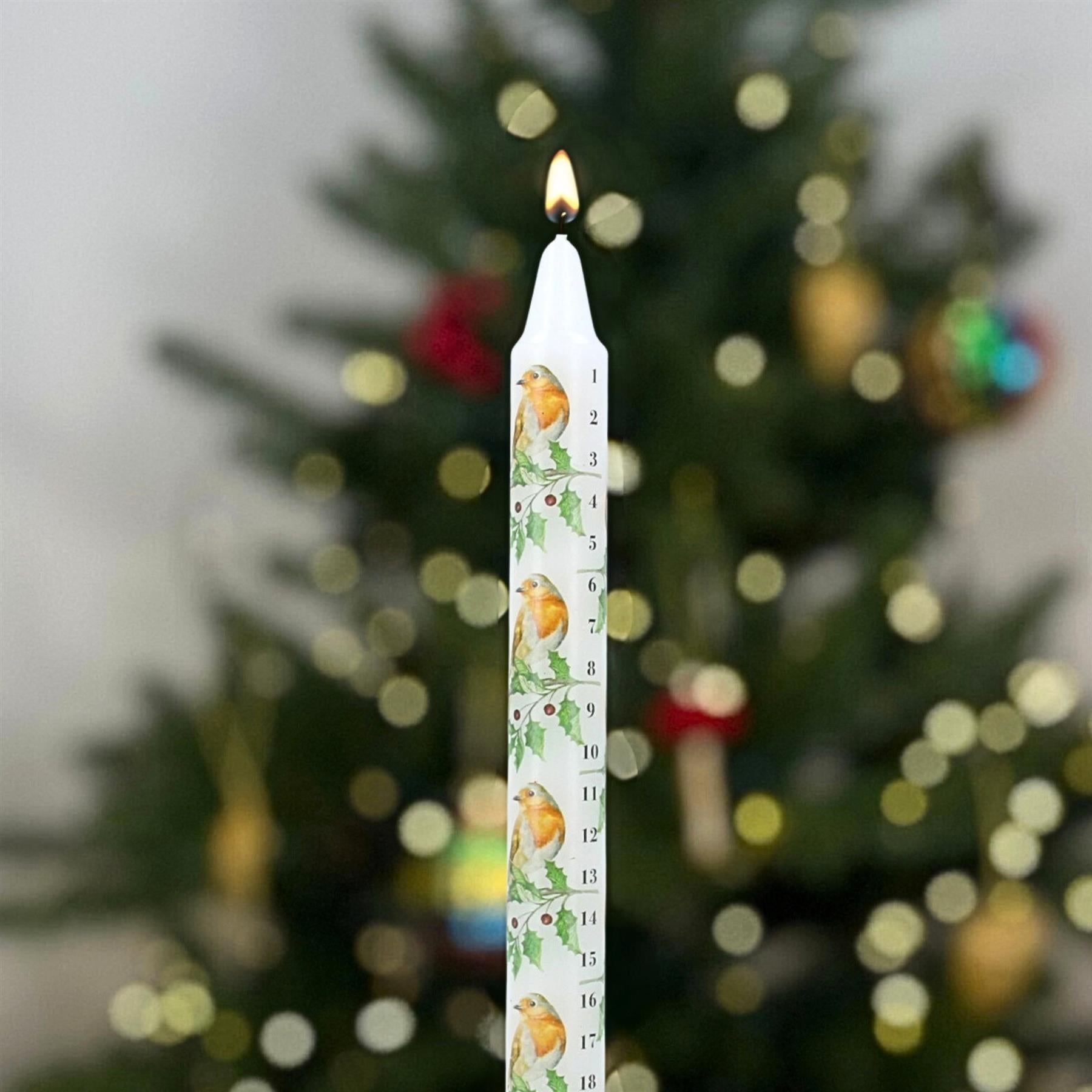 CANDLE ADVENT CALENDAR: Decorated with vibrant robins and holly leaves, this numbered candle captures the essence of traditional Christmas décor. Burn it each evening to reveal the next date in your festive countdown