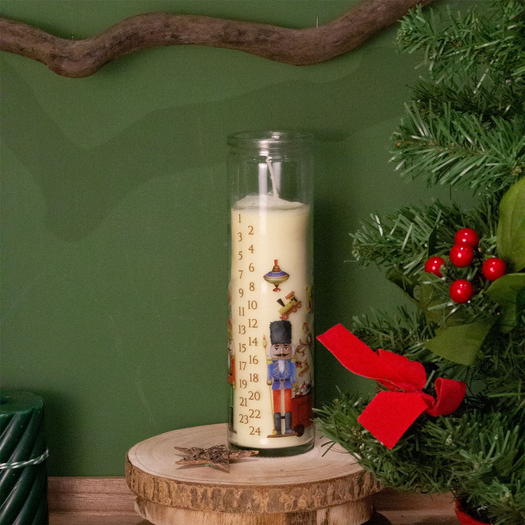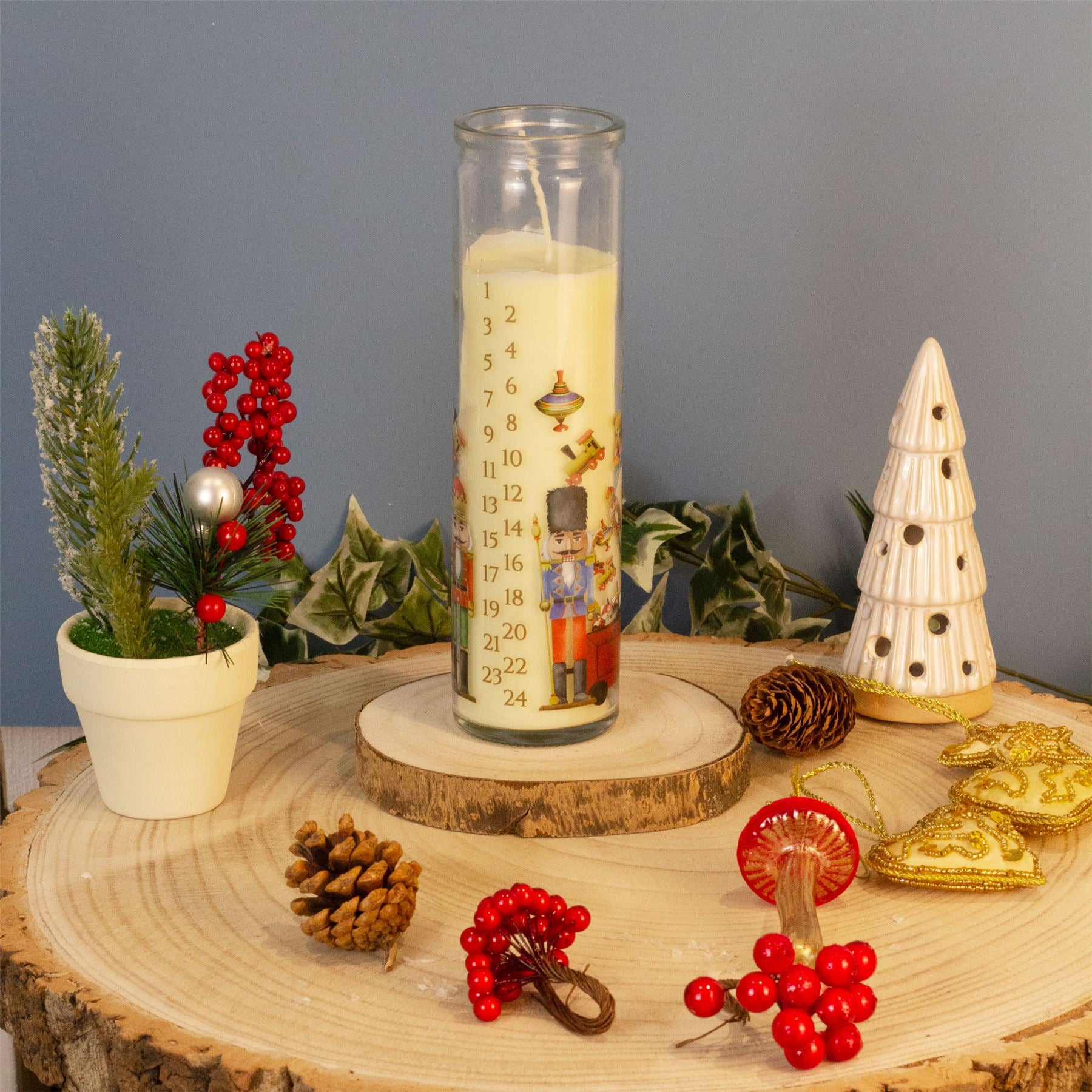 CHRISTMAS ADVENT CANDLE | Embrace the magic of Christmas with our Santa's Workshop Advent Candle. Presented in a charming glass jar, this pillar candle is numbered from 1 to 24, perfect for counting down the days to Christmas