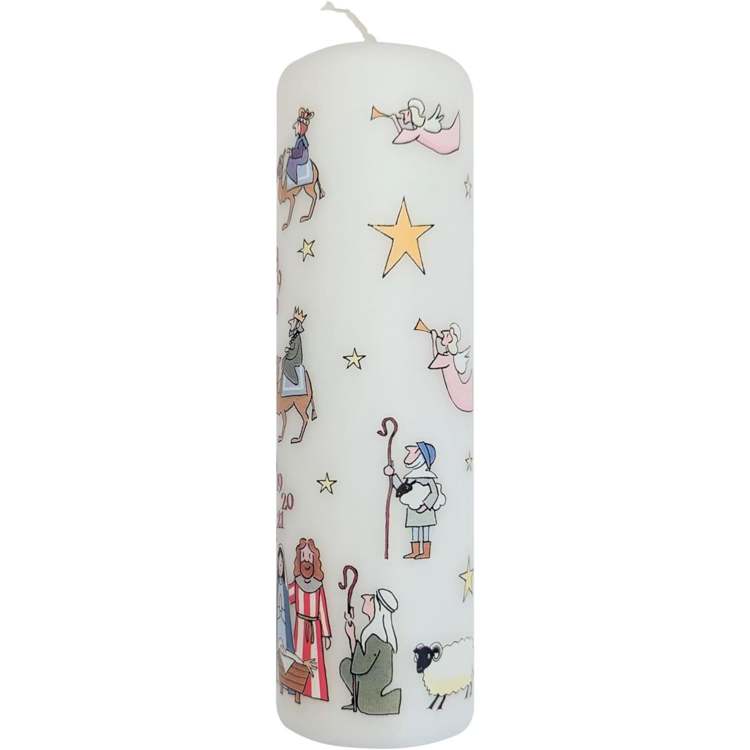 CHRISTMAS CANDLE | Welcome the Festive spirit into your home with the time honoured tradition of lighting an Advent candle each day as a countdown to Christmas Day. The pillar Advent candle is decorated with delightful images from the Christmas nativity all in vibrant, colourful print