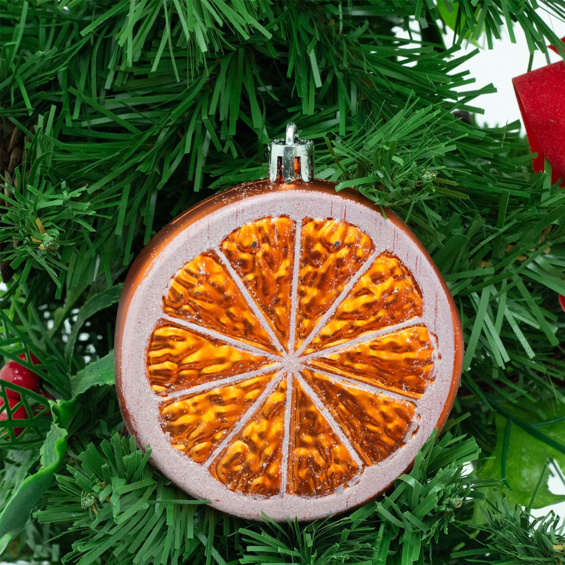 Bring colour and fun to your Christmas tree with this set of 9 fruit ornaments. Glittery, bright, and beautifully detailed - perfect for a cheerful festive twist