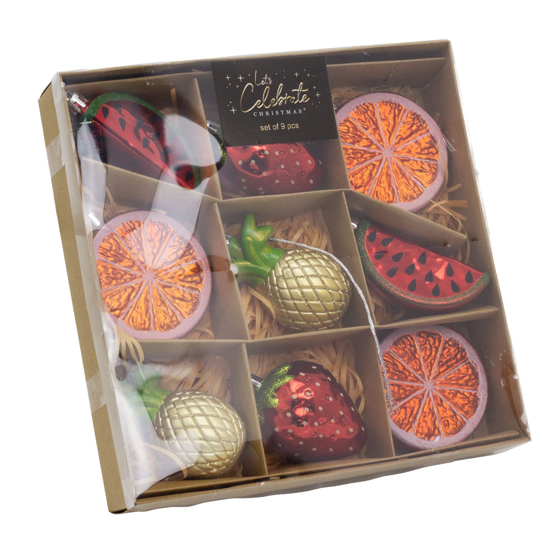 QUIRKY FRUIT ORNAMENTS | Add a fun, fruity twist to your festive decor with this colourful set of 9 baubles in watermelon, pineapple, orange, and strawberry designs