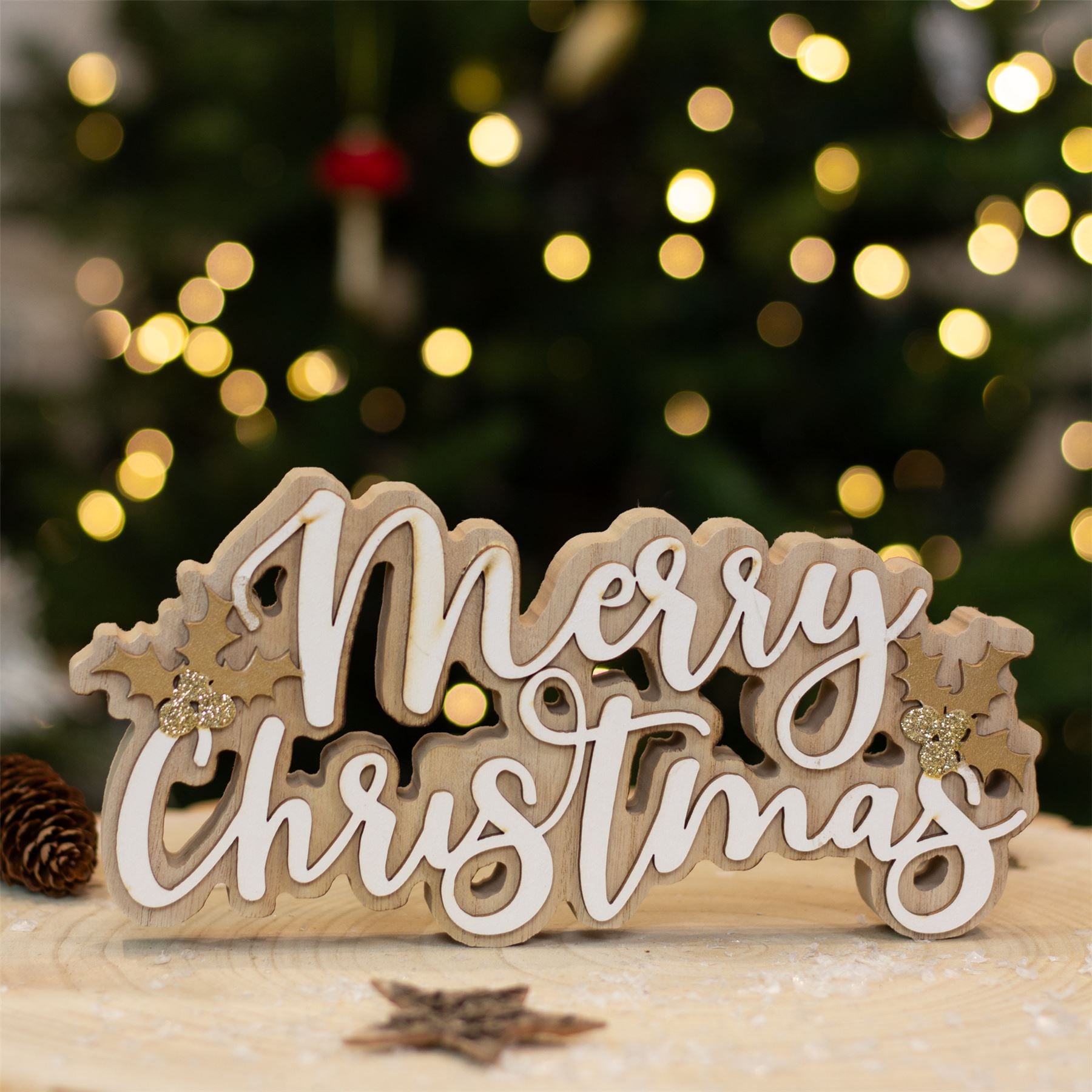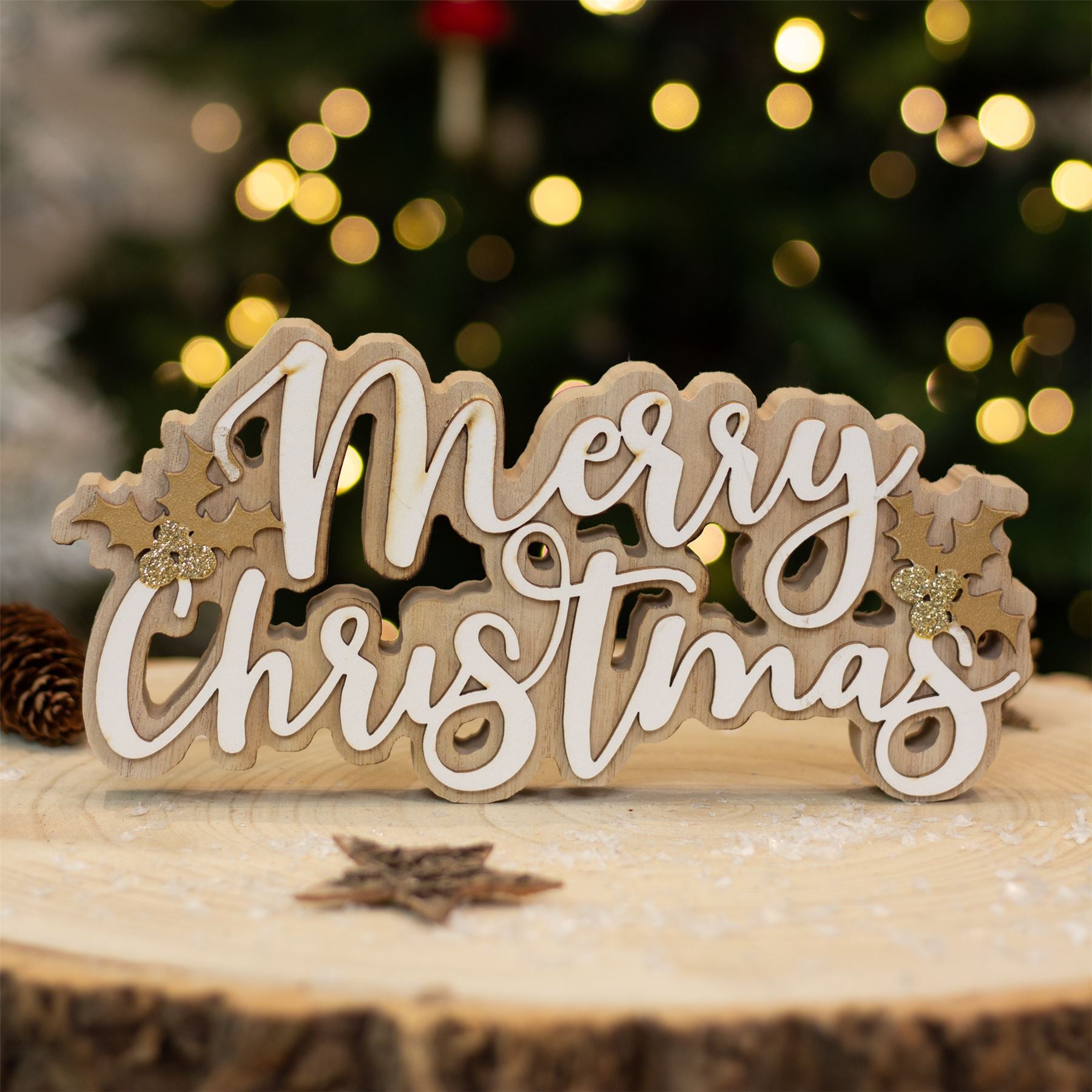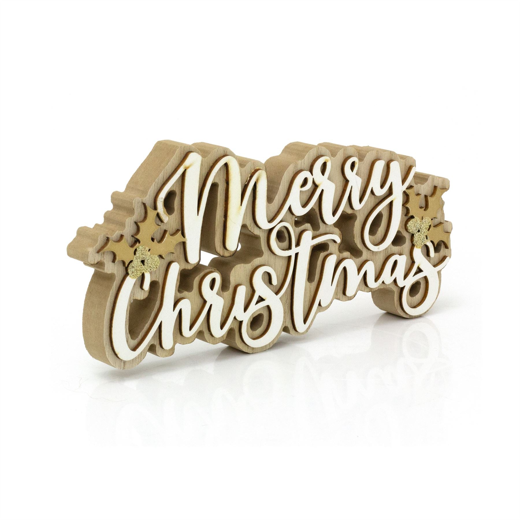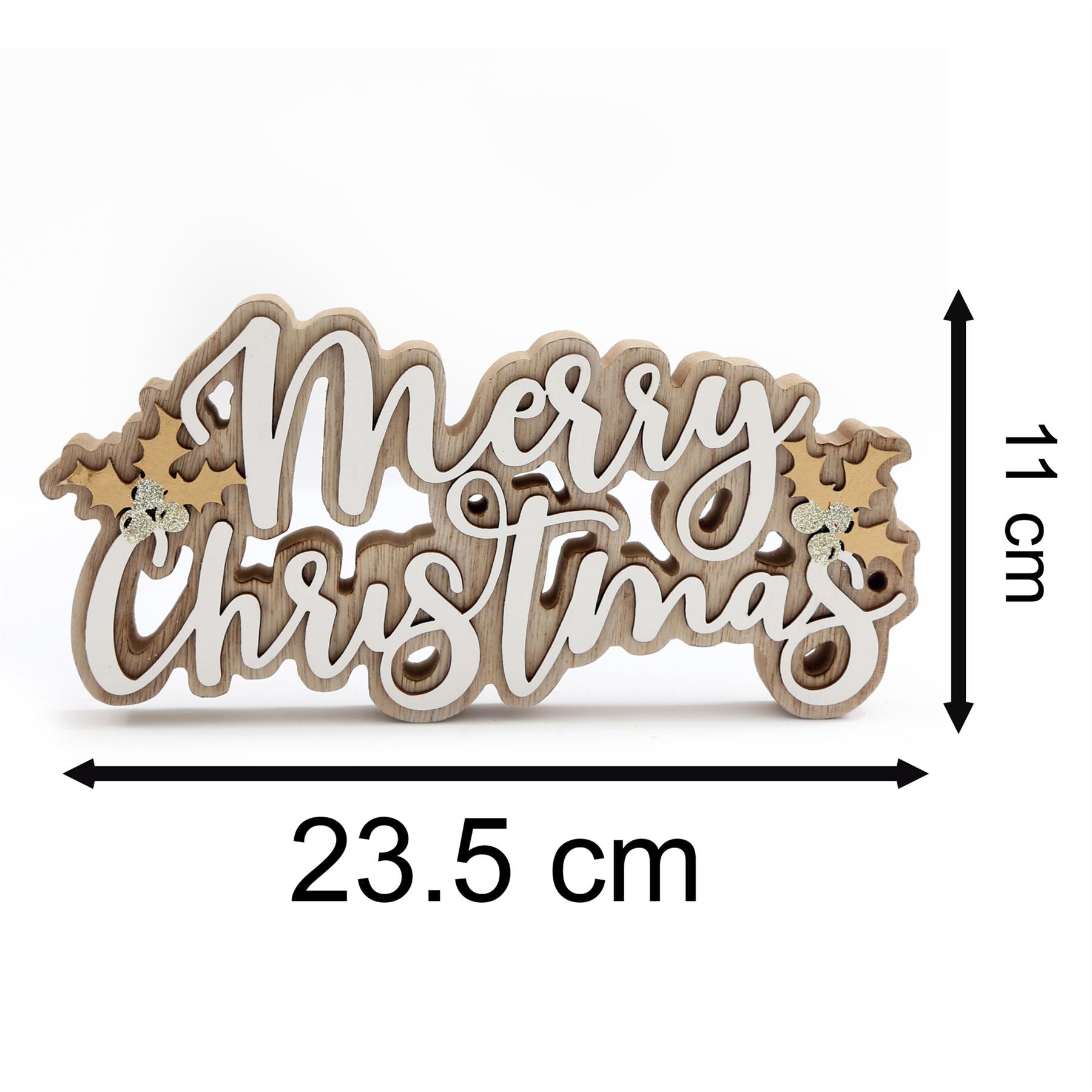 Get your home ready for the festive season with our charming wooden "Merry Christmas" word block. This delightful tabletop sign features elegant white text complemented by sparkling gold glitter holly accents, bringing a cheerful touch to any room