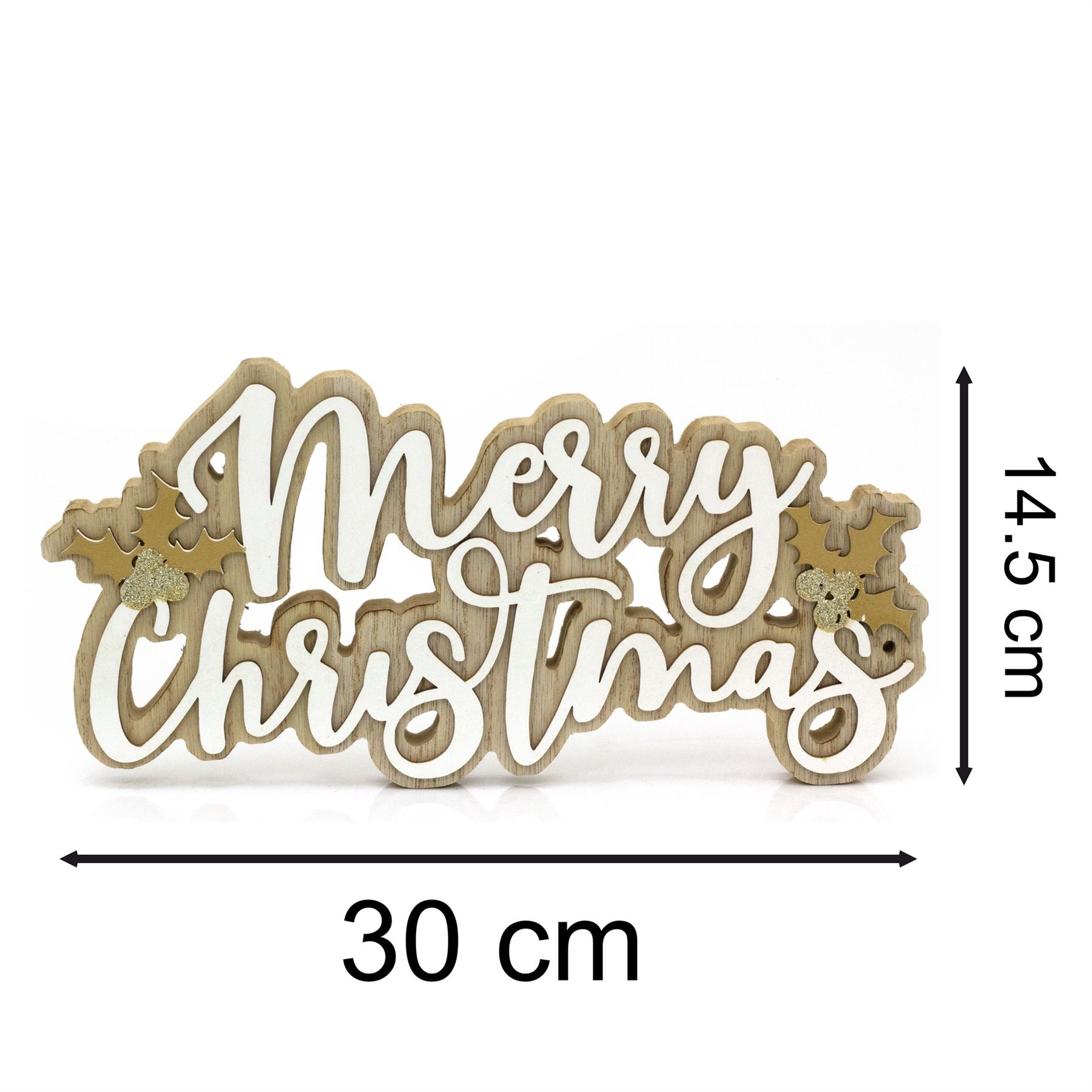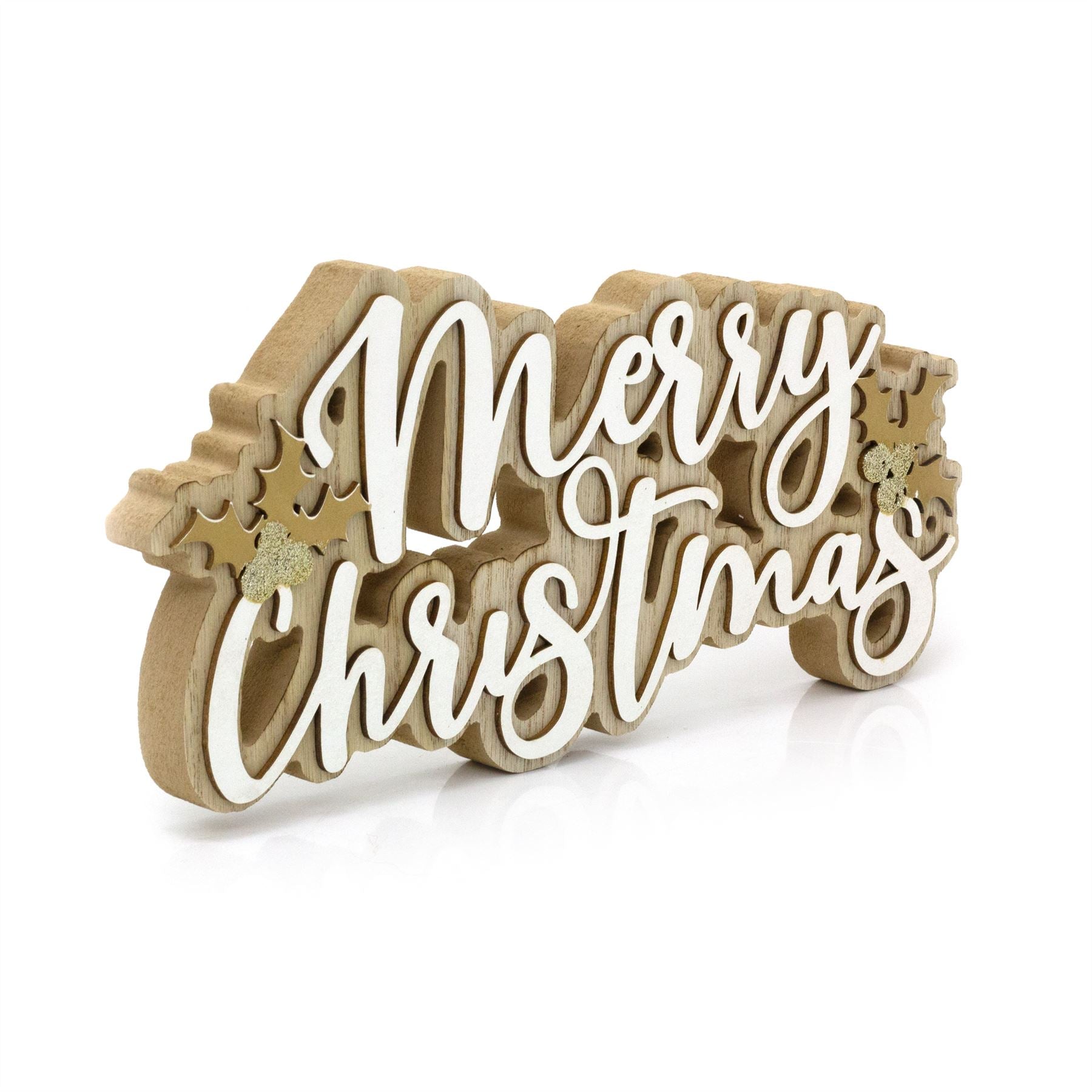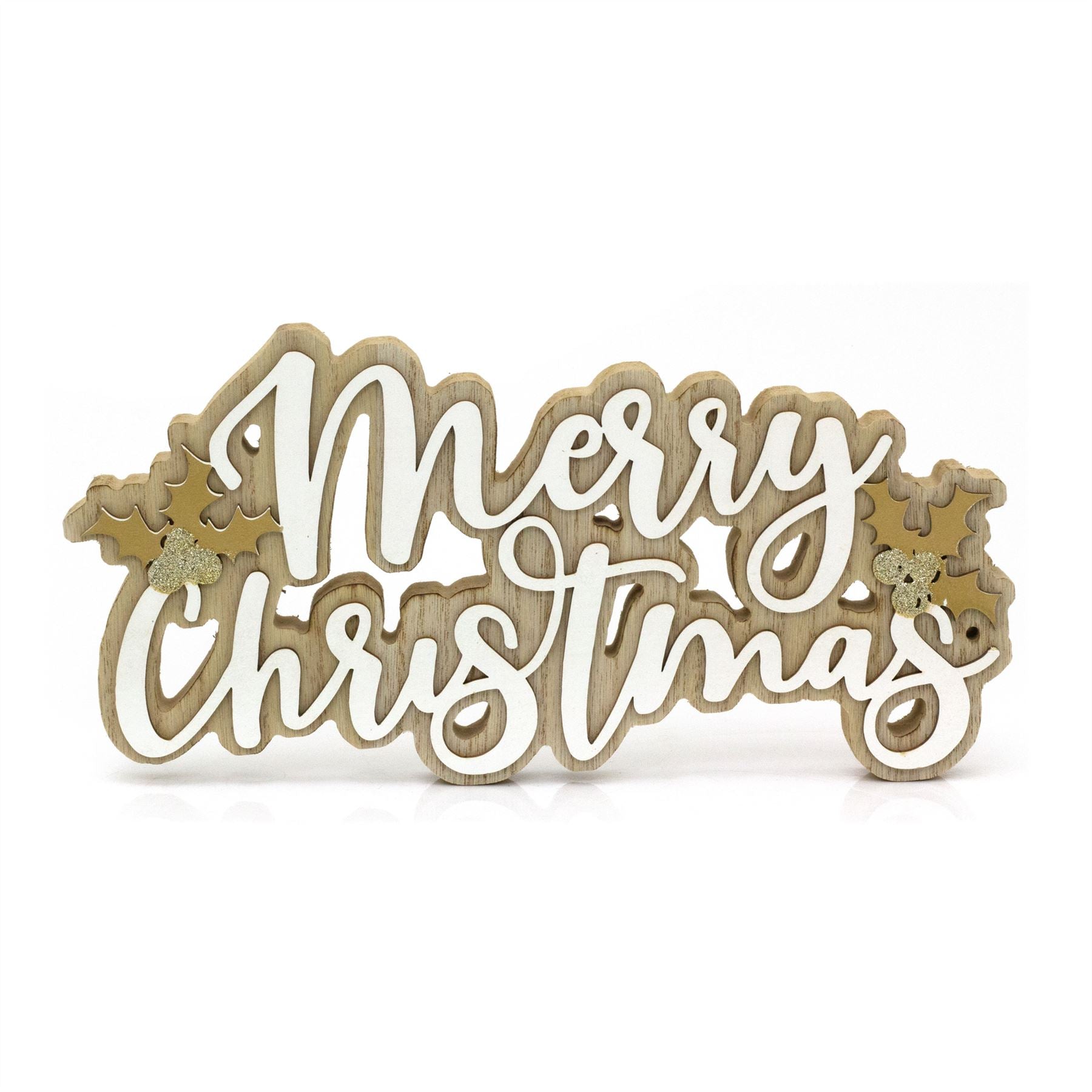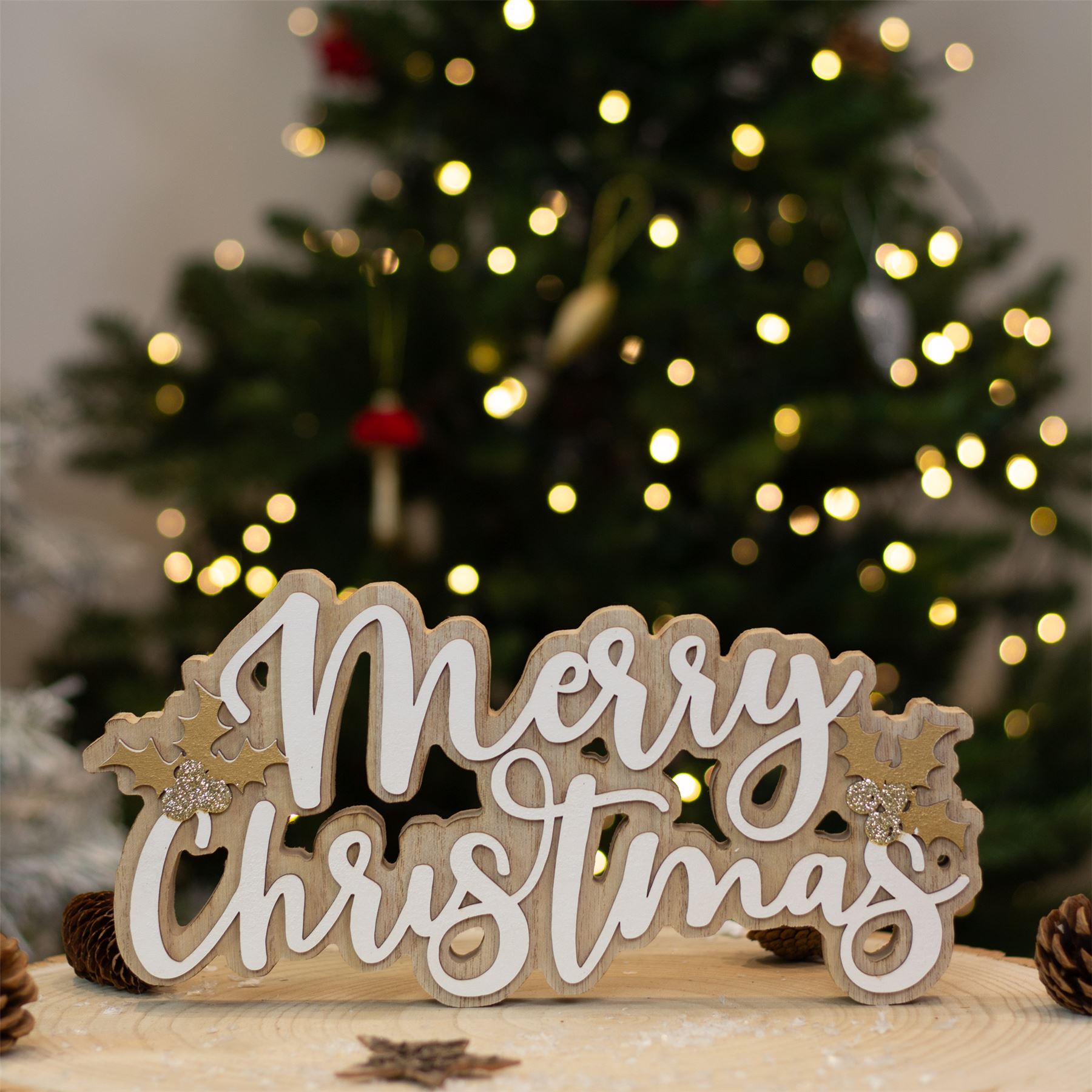 Get your home ready for the festive season with our charming wooden "Merry Christmas" word block. This delightful tabletop sign features elegant white text complemented by sparkling gold glitter holly accents, bringing a cheerful touch to any room