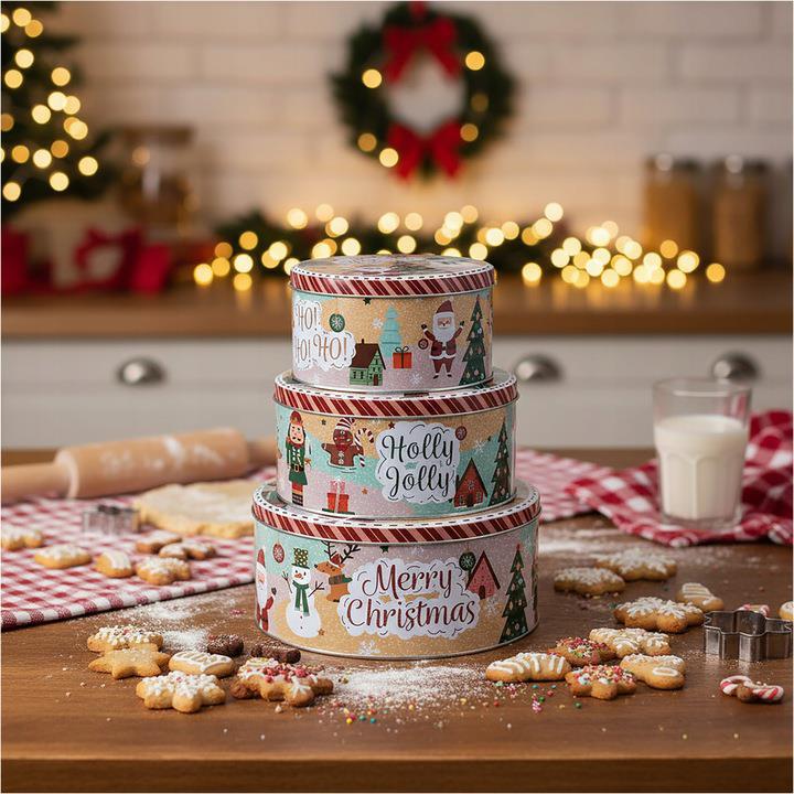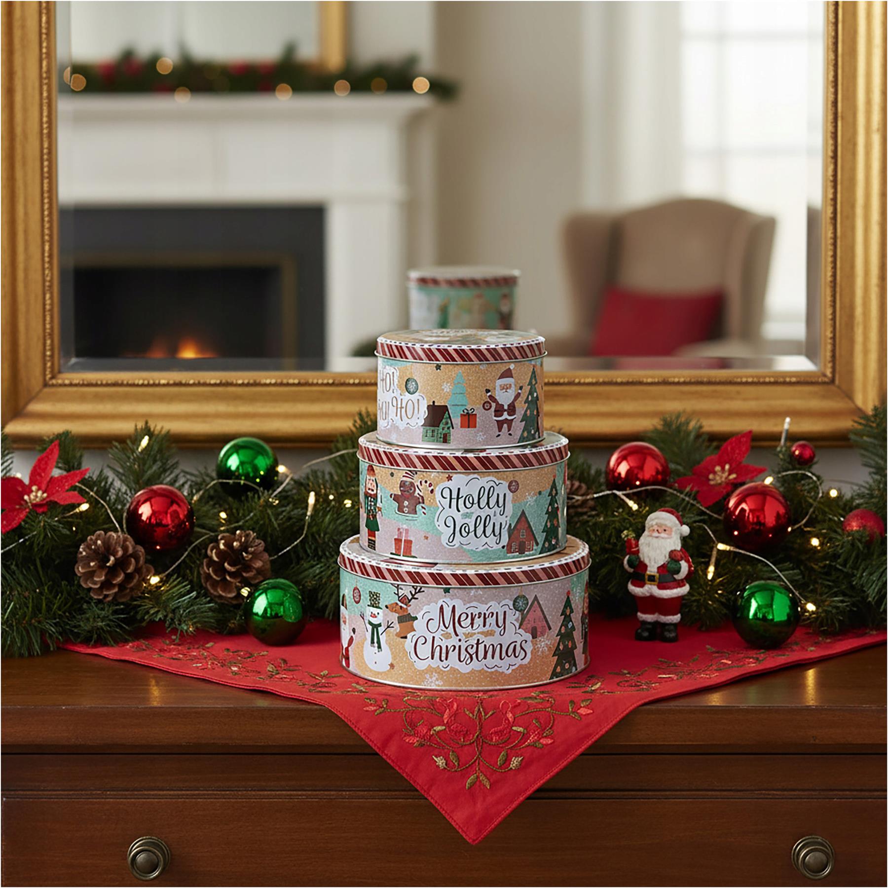 Set of 3 Christmas Storage Tins | 3-piece Triple Festive Round Nesting Tins