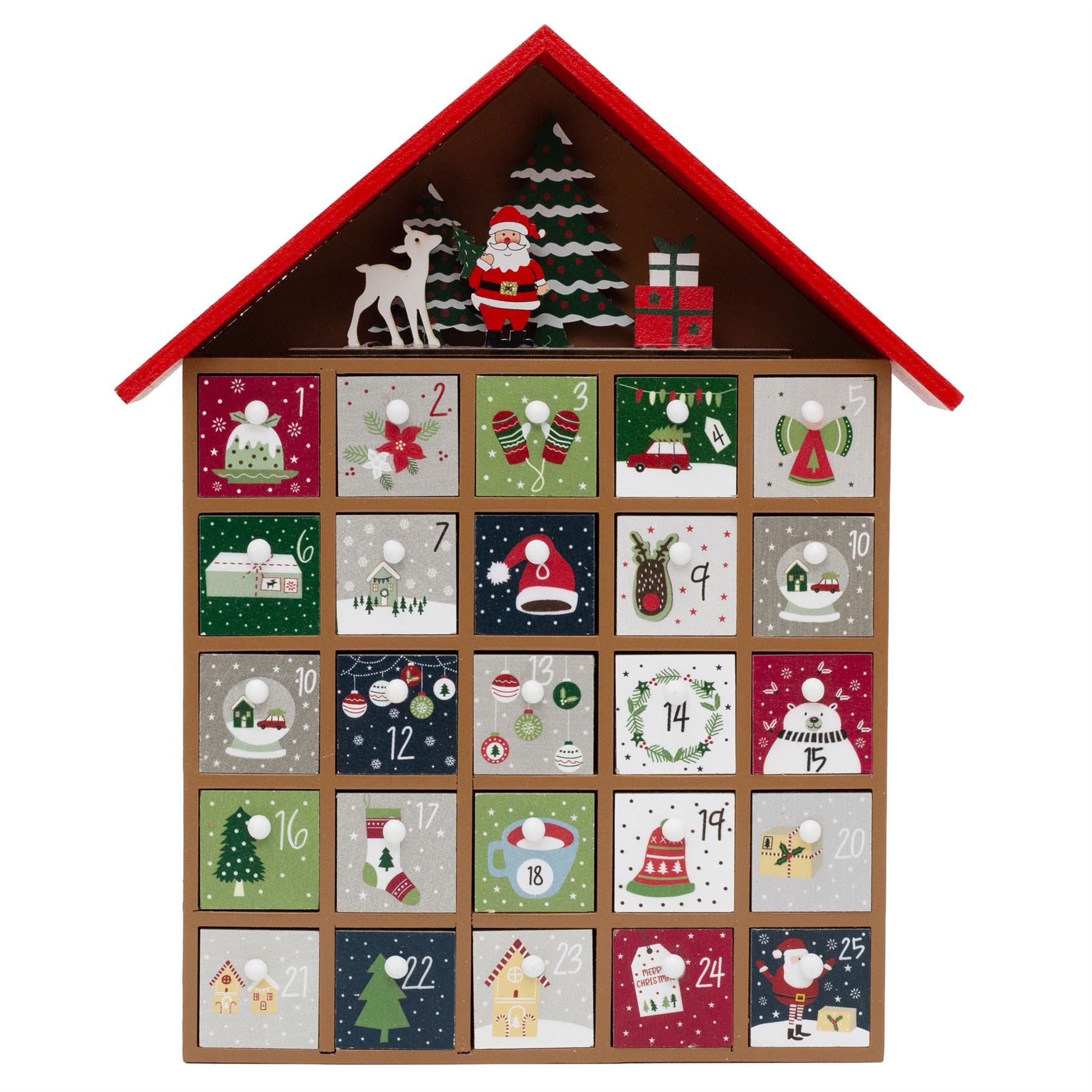 ADVENT CALENDAR | A delightful advent calendar in the shape of a cosy red-roofed house with cheerful Christmas prints on each drawer, including Santa, reindeer, baubles, and more