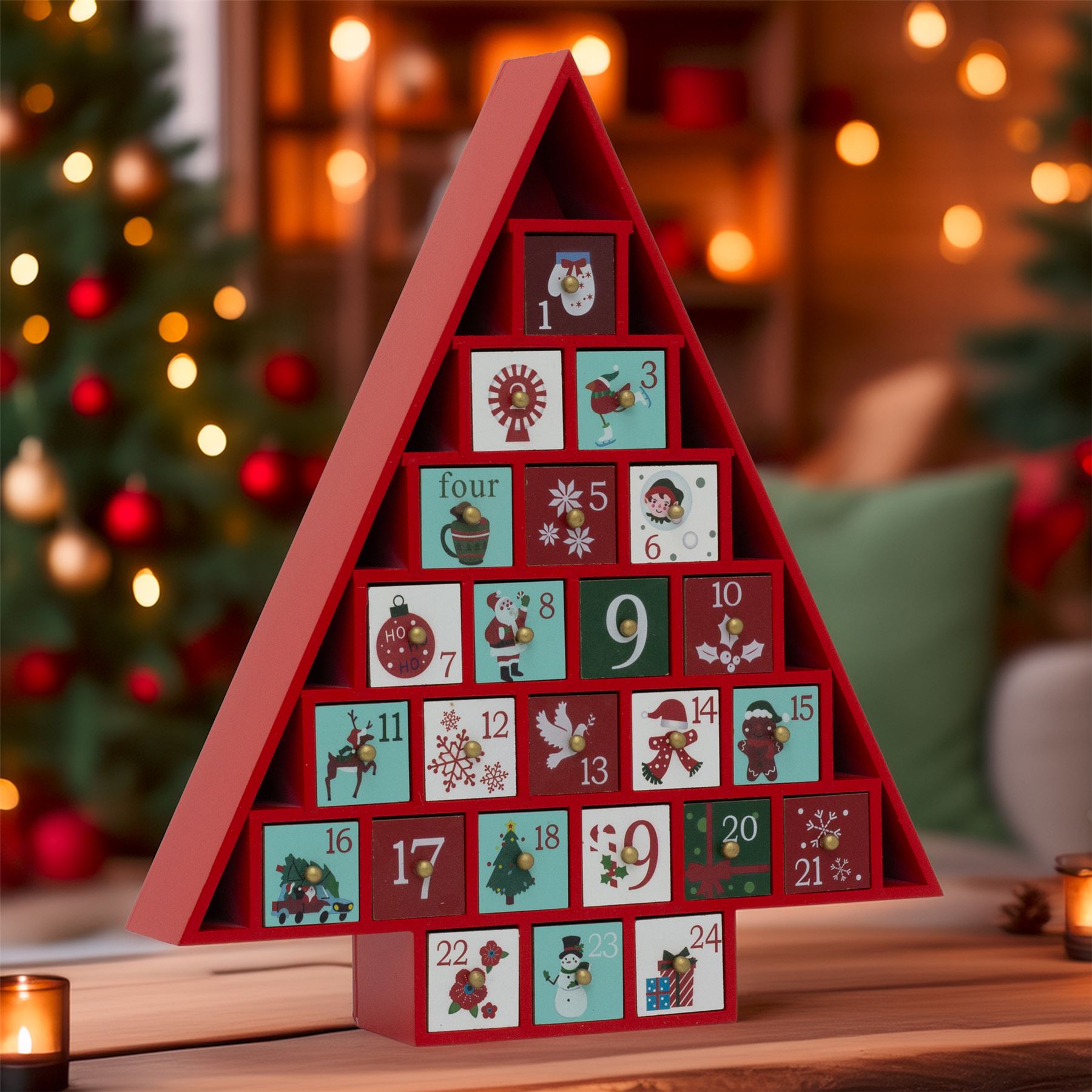 Countdown to Christmas in festive style with this charming red wooden advent calendar. Featuring 24 drawers, it’s perfect for filling with sweets, toys, or treats