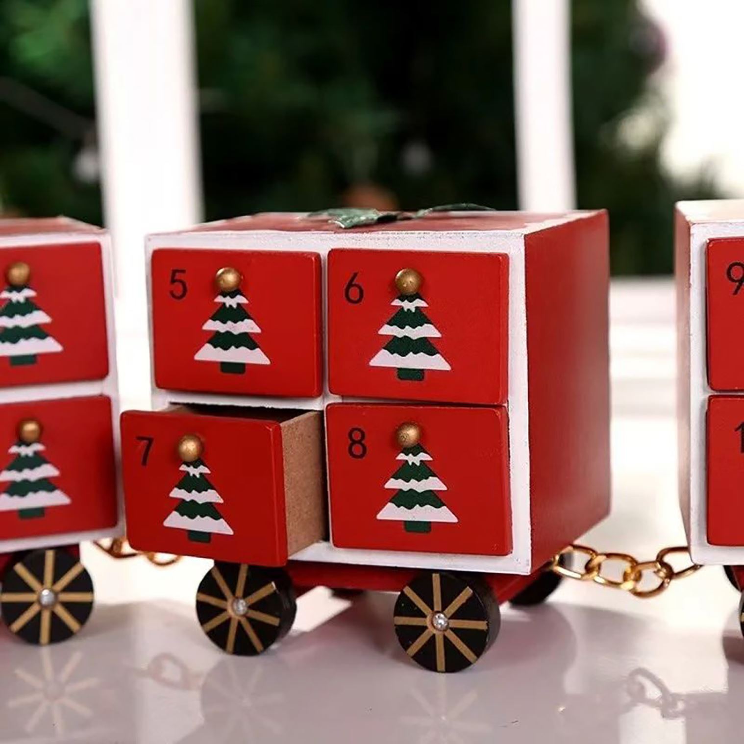 Make Christmas magical with a wooden toy train advent calendar featuring festive details and 24 fillable drawers with room for treats, toys, or notes