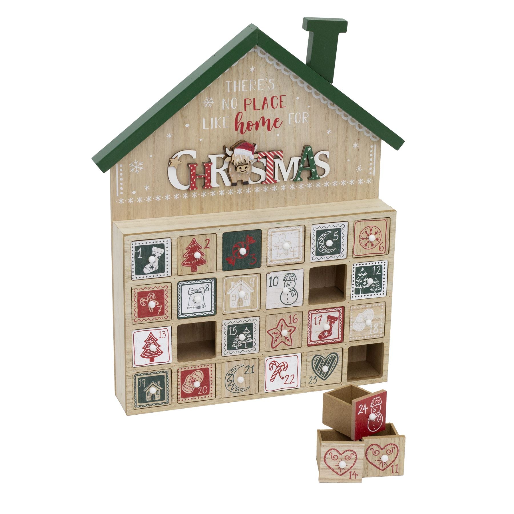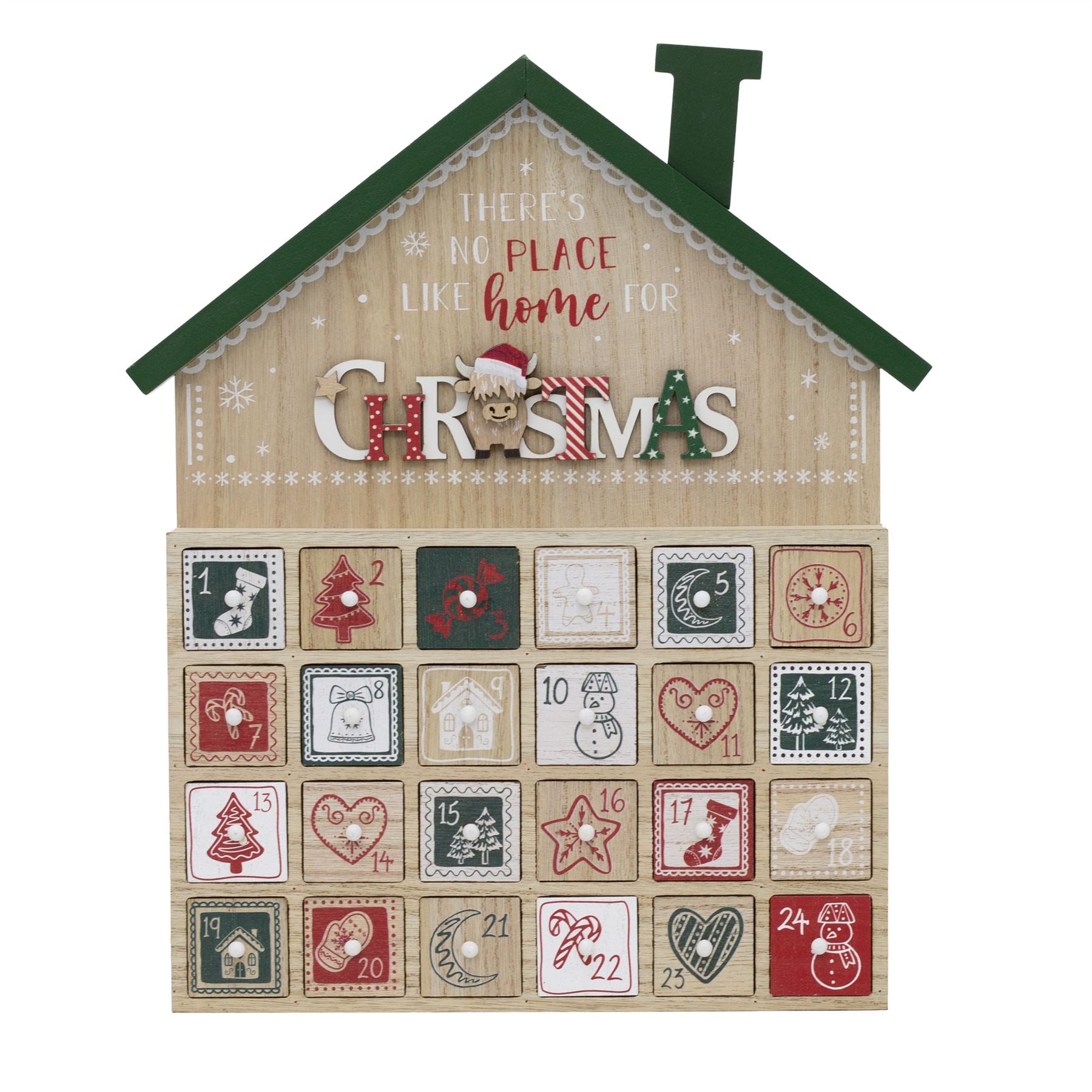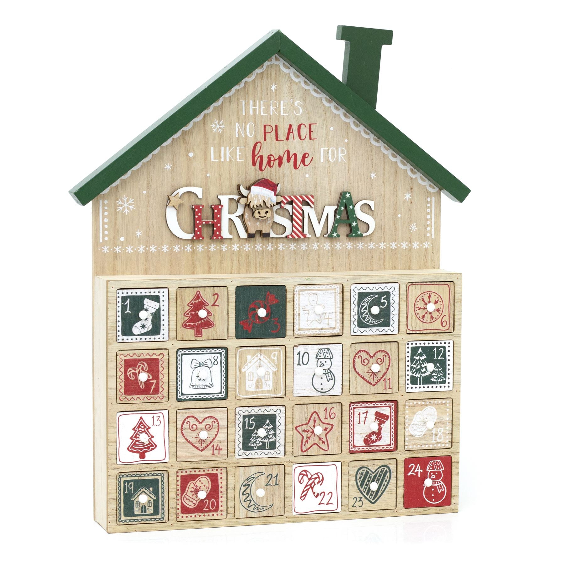 Celebrate Christmas with a reusable wooden advent calendar featuring 24 drawers, a cute highland cow design, and plenty of space for personalised treats