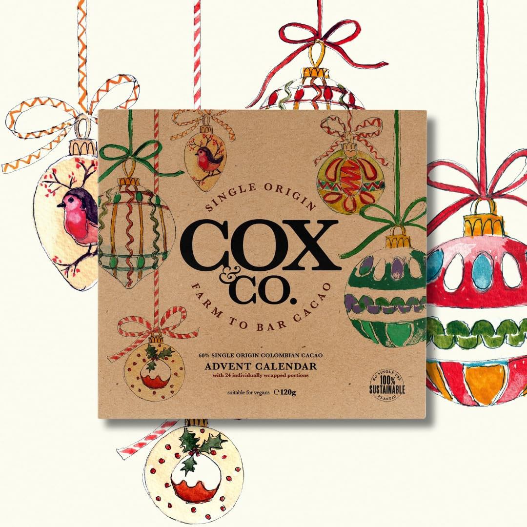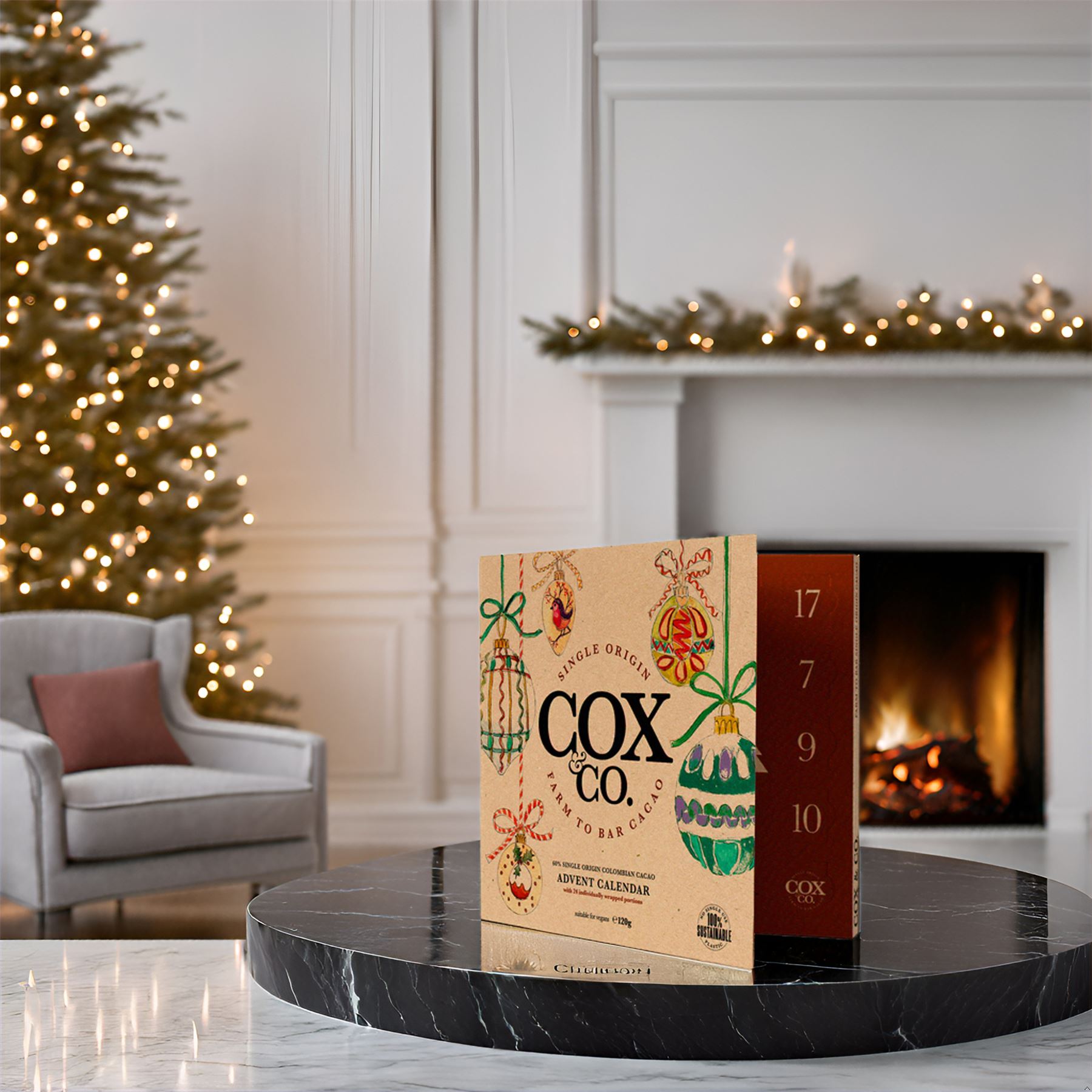 Countdown to Christmas with Cox & Co single-origin dark chocolate advent calendar. Smooth, rich caramel and coffee notes in ethical, beautifully packaged treats