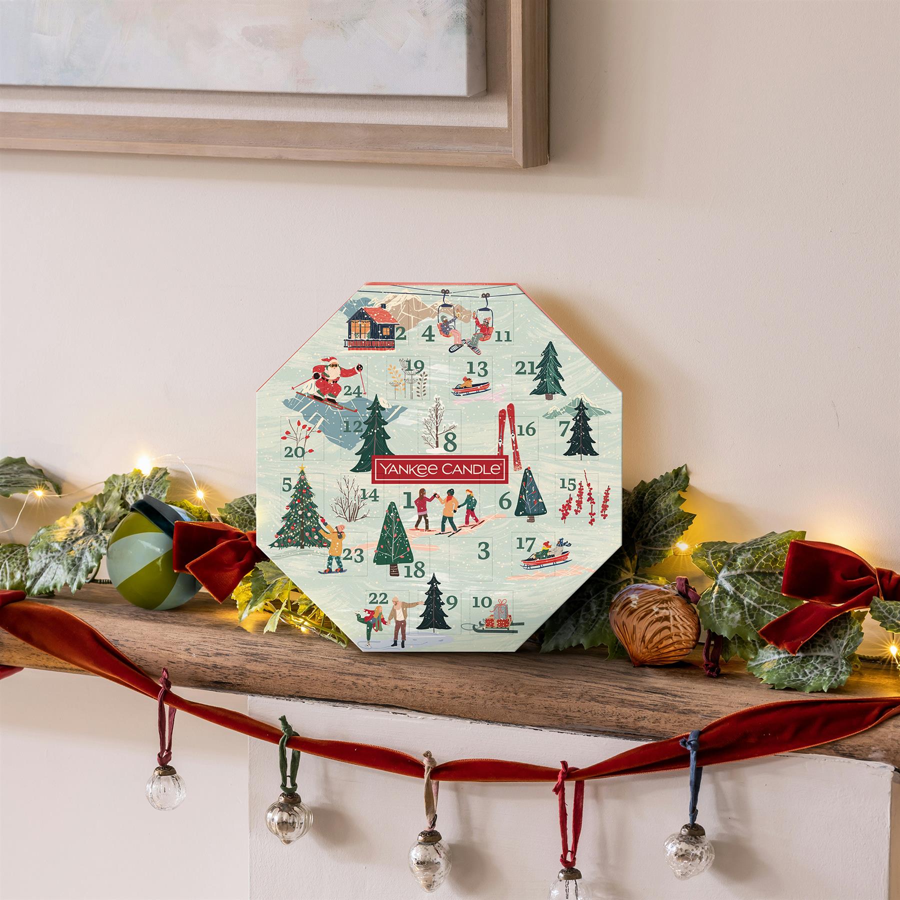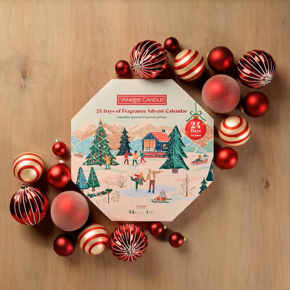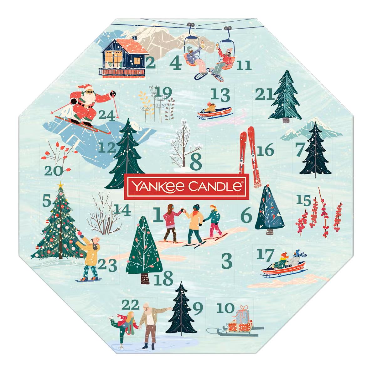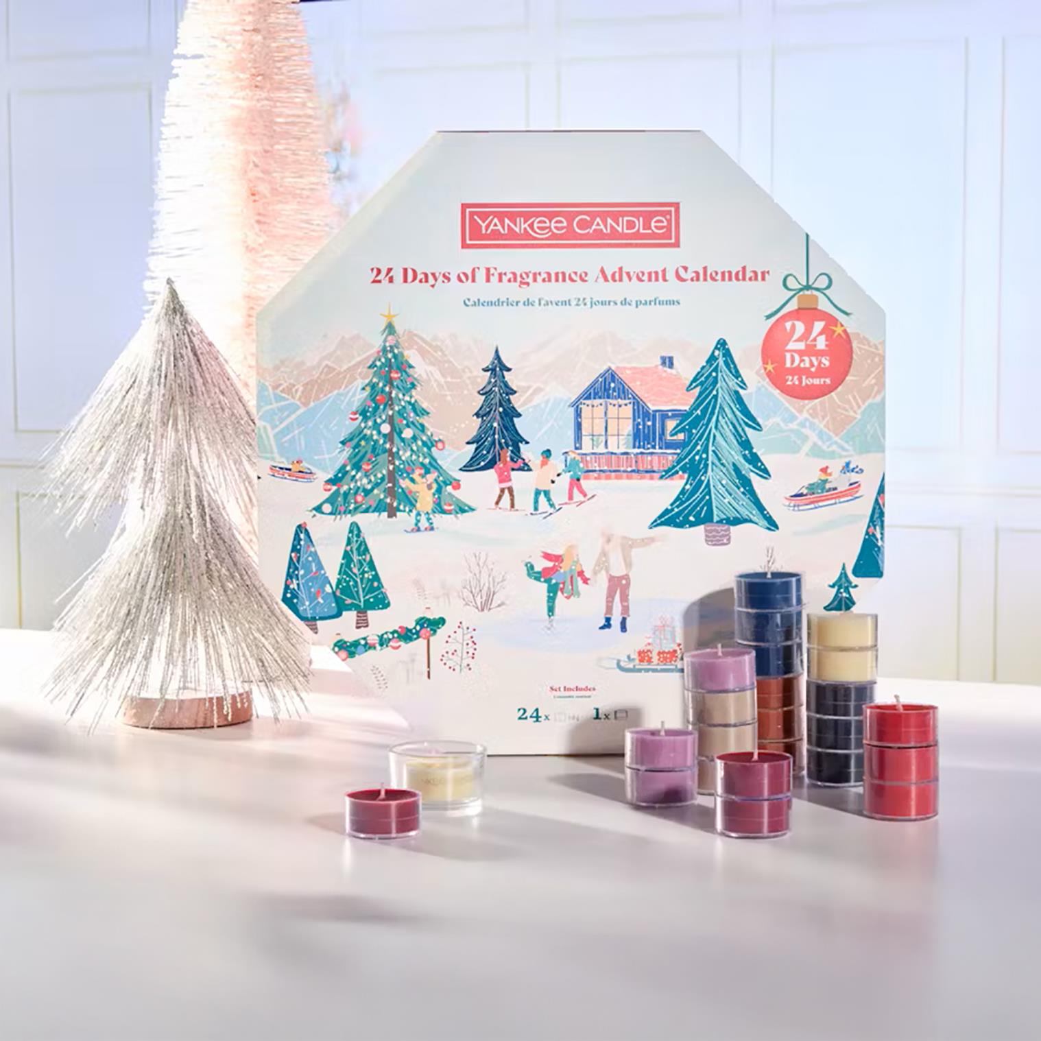 Yankee Candle Christmas Advent Calendar with 24 scented tea lights and glass holder. Enjoy festive scents from Christmas Cookie to Winter Night Stars, perfect for a cosy holiday countdown