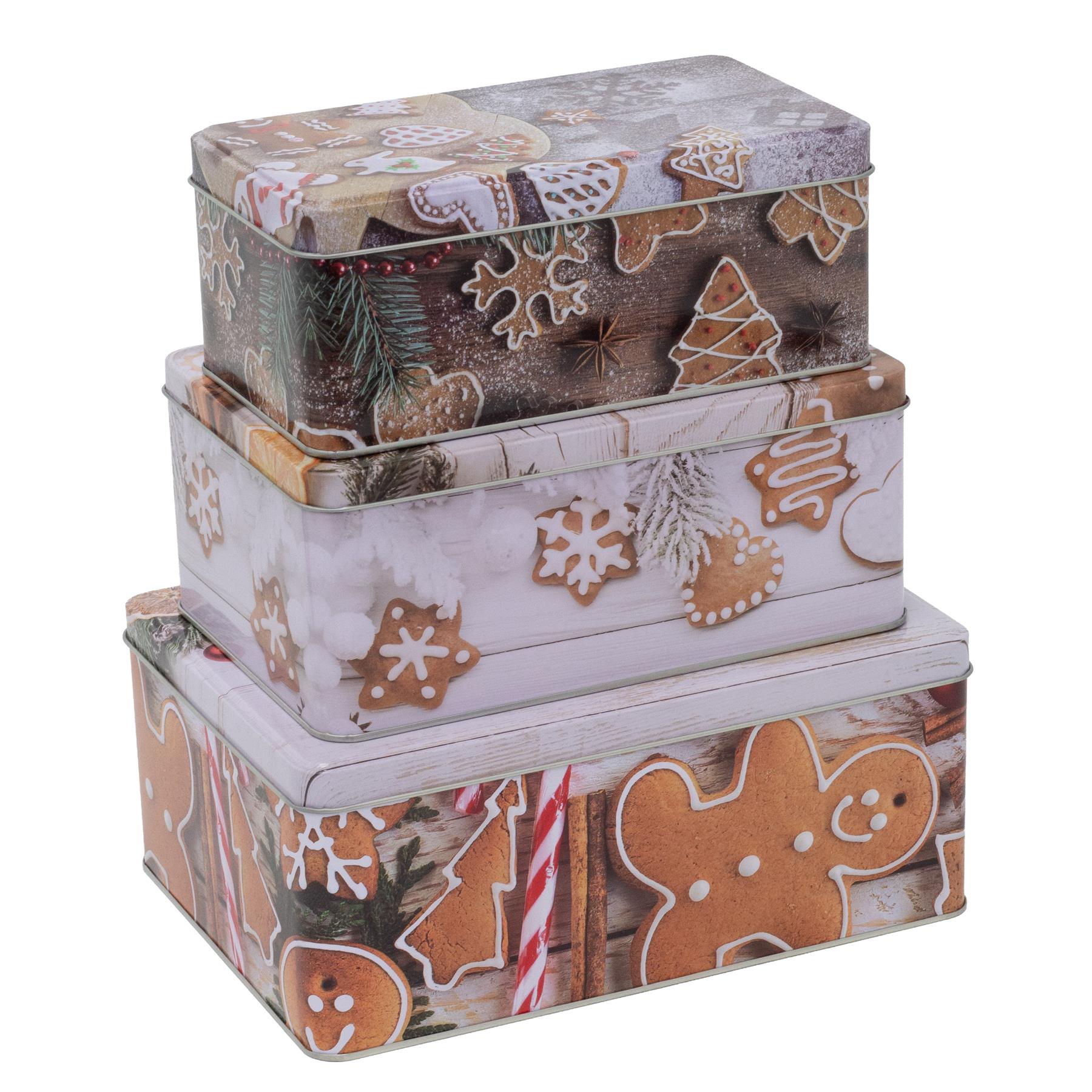 Set of 3 Gingerbread Christmas Storage Tins | Festive Rectangle Nesting Tins