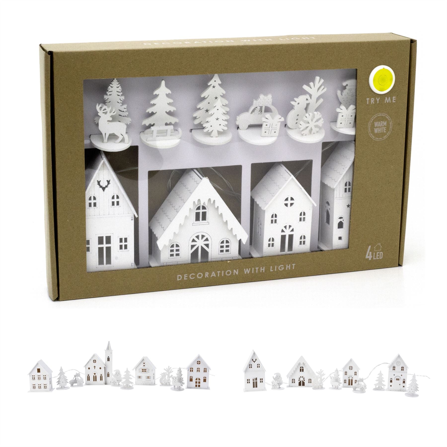 SOFT LED GLOW | Each of the four light-up houses is adorned with warm white LED lights, creating a magical glow that transforms your space into a cosy haven, perfect for display on mantels, window sills, or festive tables. Please note: Each order will receive a randomly selected design