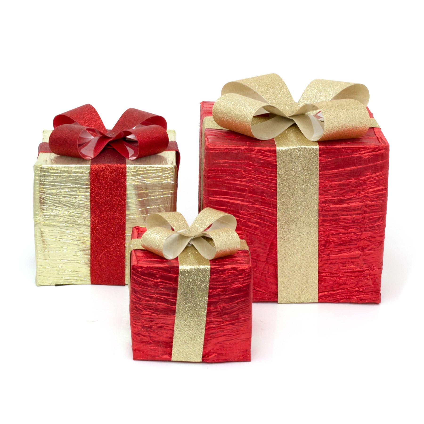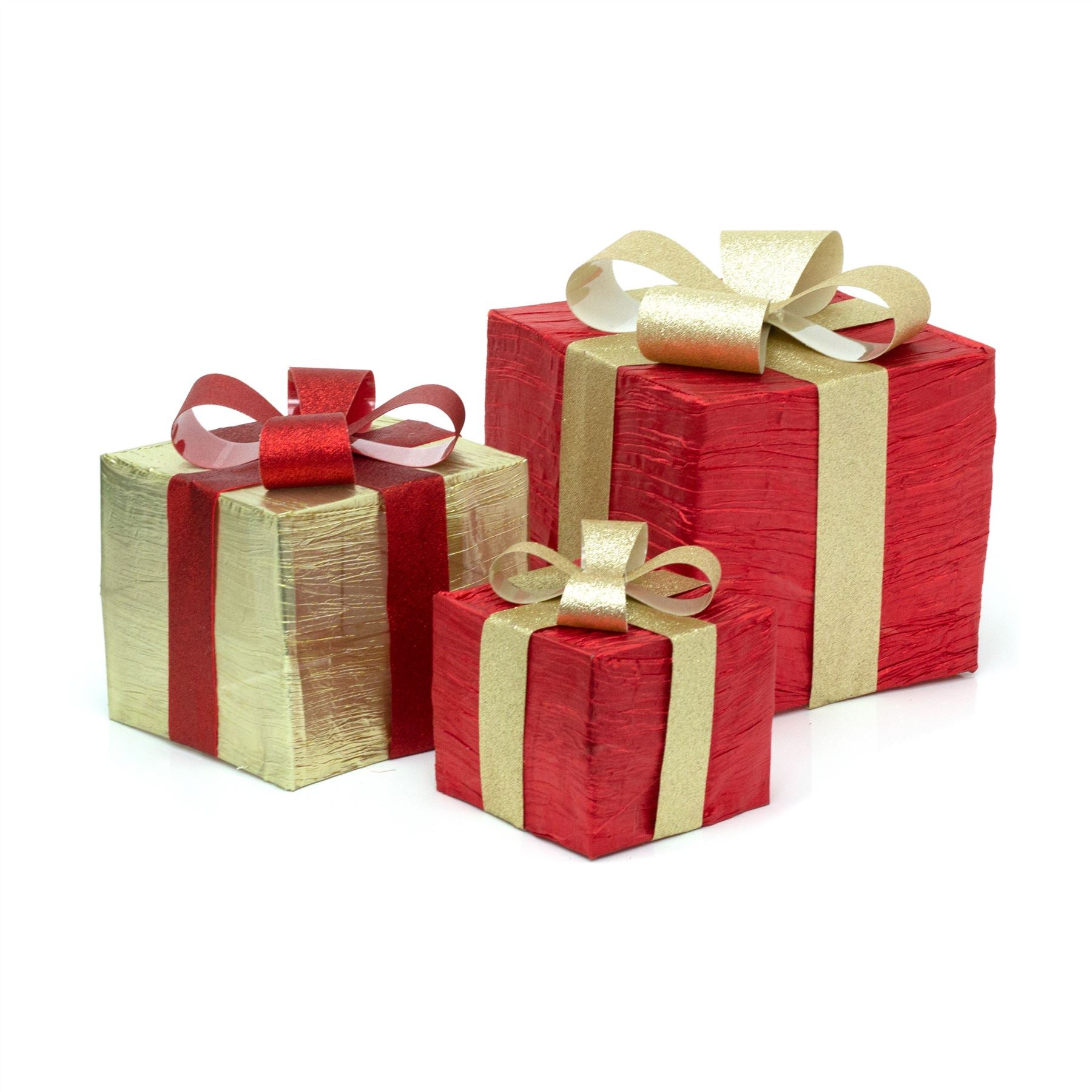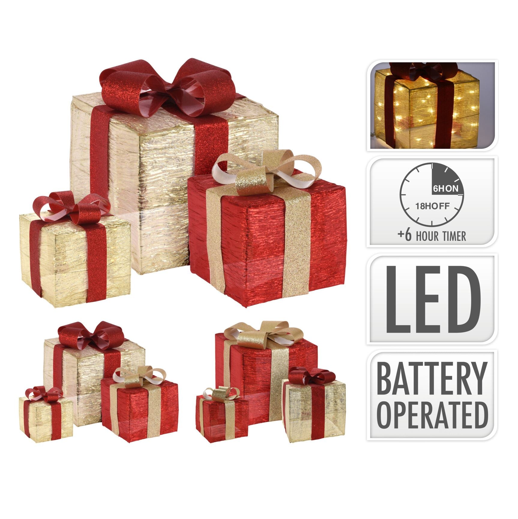 LED CHRISTMAS PRESENT BOXES | Simply gorgeous set of red & gold LED Christmas present boxes. The gifts boxes can be displayed individually, as each has its own battery housing, but they look absolutely stunning when clustered together. Wonderful to create a Christmas arrangement in your home