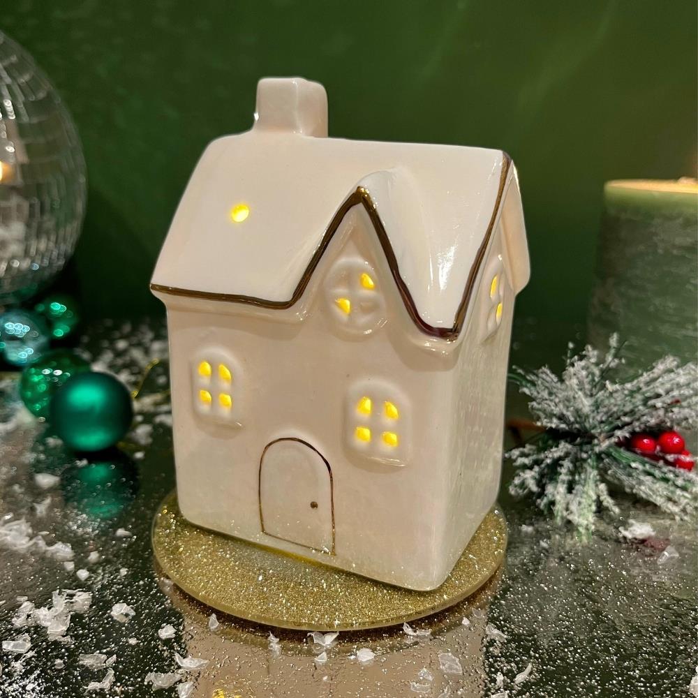 LED CERAMIC HOUSE | Brighten up your home with this charming white ceramic house, featuring a gentle LED glow that adds warmth and festive cheer