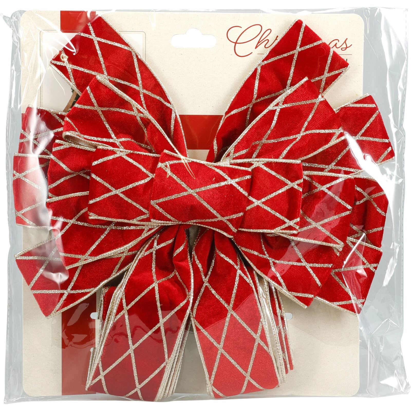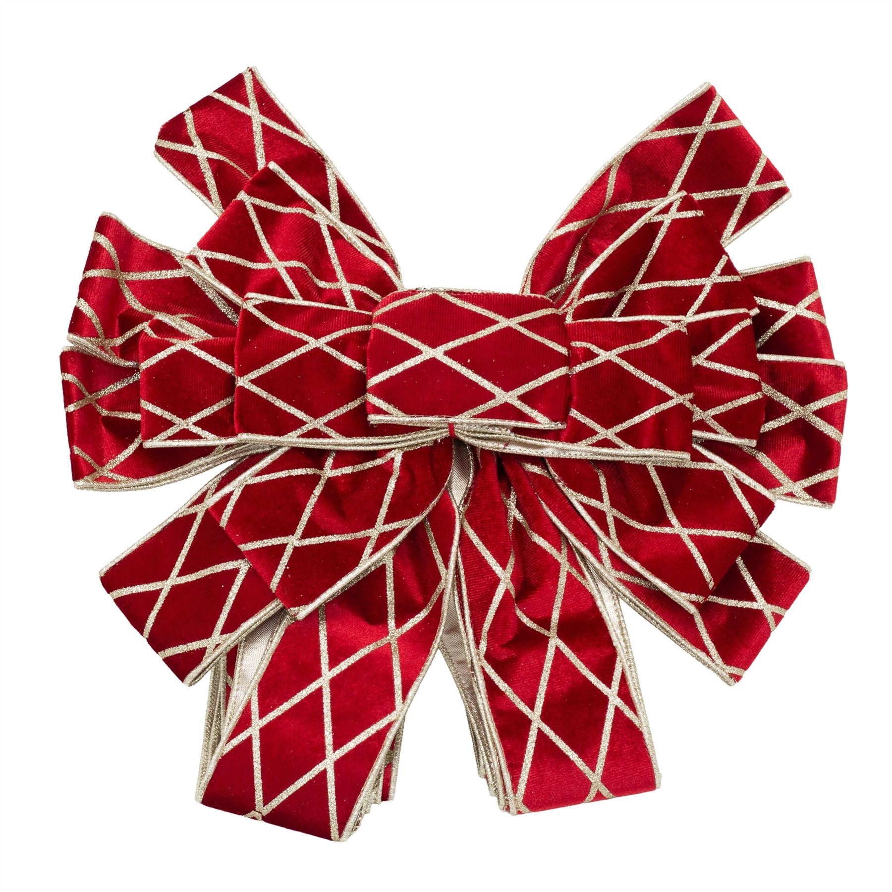 FESTIVE TREE TOP BOW | Luxurious red velveteen bow with sparkling gold diamond check pattern adds glamour and festive cheer to your tree