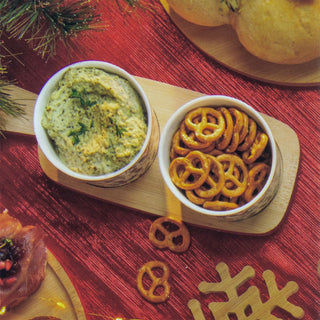 Christmas Mistletoe Serving Set | 2 Ceramic Snack Bowls with Bamboo Paddle Tray