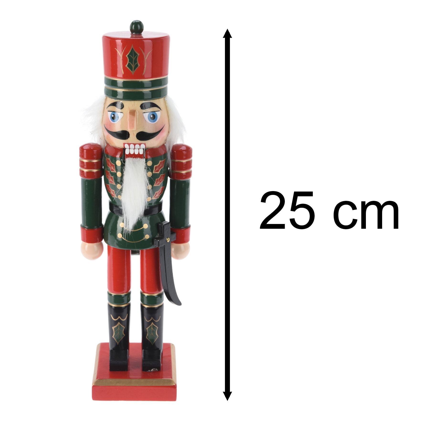 This charming wooden Nutcracker figure embodies the spirit of the festive season! Standing at 25cm tall, this delightful ornament is crafted from solid wood and features intricate hand-painted details that will brighten your home during the holidays. With a classic soldier uniform and an interactive movable mouth, this nutcracker adds a playful element to your Christmas decor. Ideal for positioning by the fireplace, under the Christmas tree, or in a hallway to welcome guests, it’s also perfect for gifting. Designed to be cherished for years, this nutcracker is a timeless addition to your Christmas collection