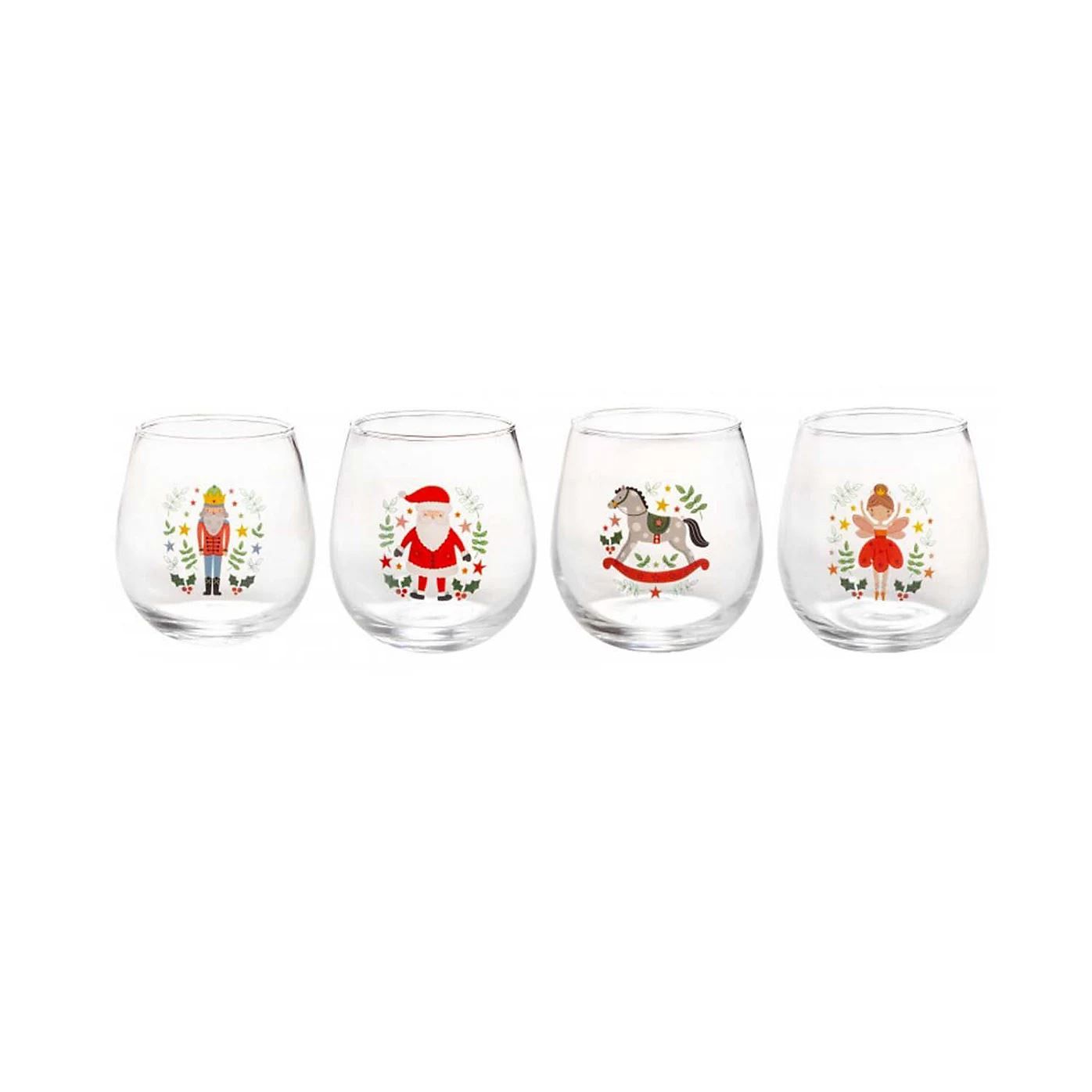 FESTIVE GLASSWARE | Enjoy every sip in style with this set of 4 Christmas glasses, featuring Santa, the Nutcracker, a fairy, and a rocking horse design