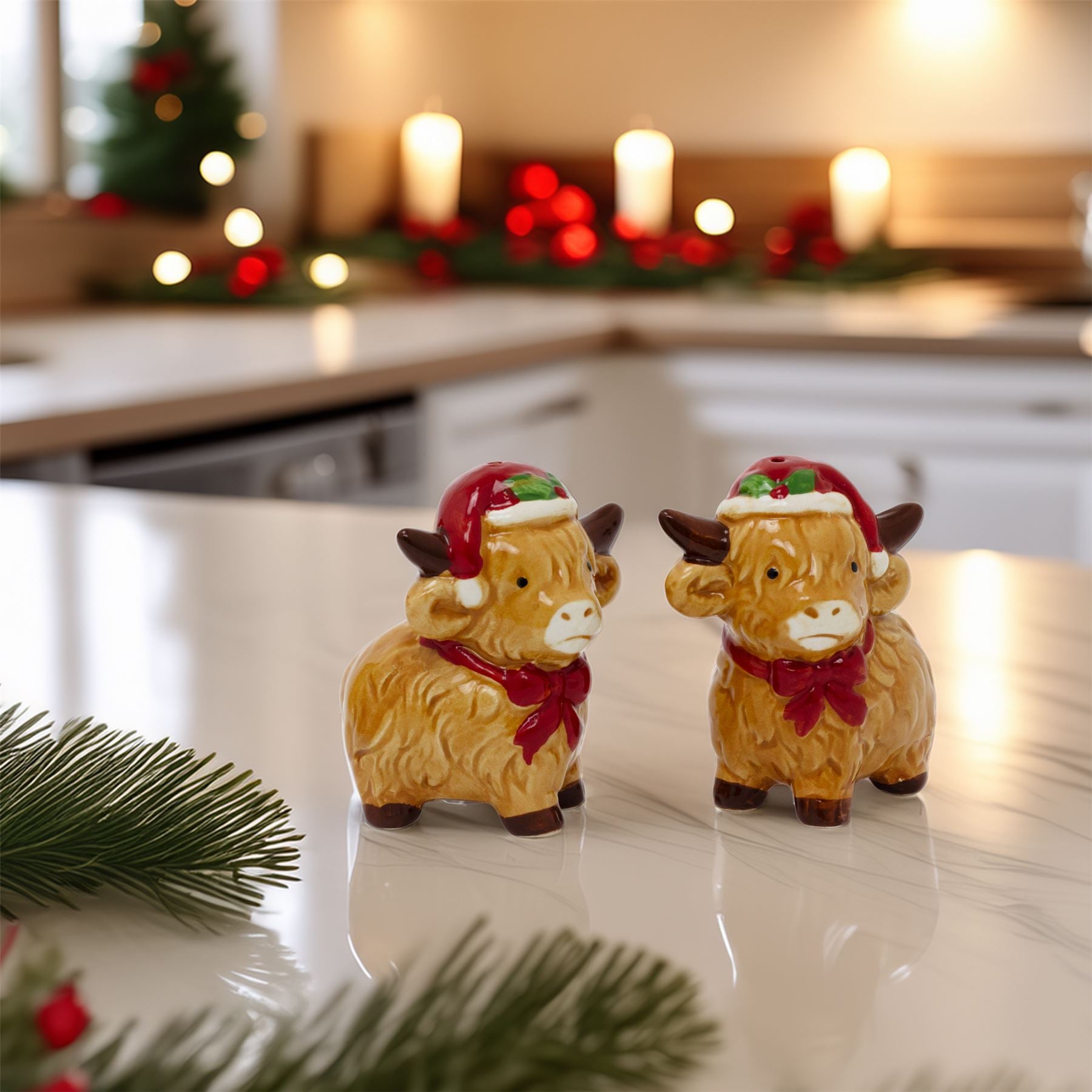 ADORABLE FESTIVE DESIGN | Add a touch of Highland cheer to your Christmas dining with these charming cow-shaped shakers, featuring Santa hats, bows, and plenty of seasonal spirit