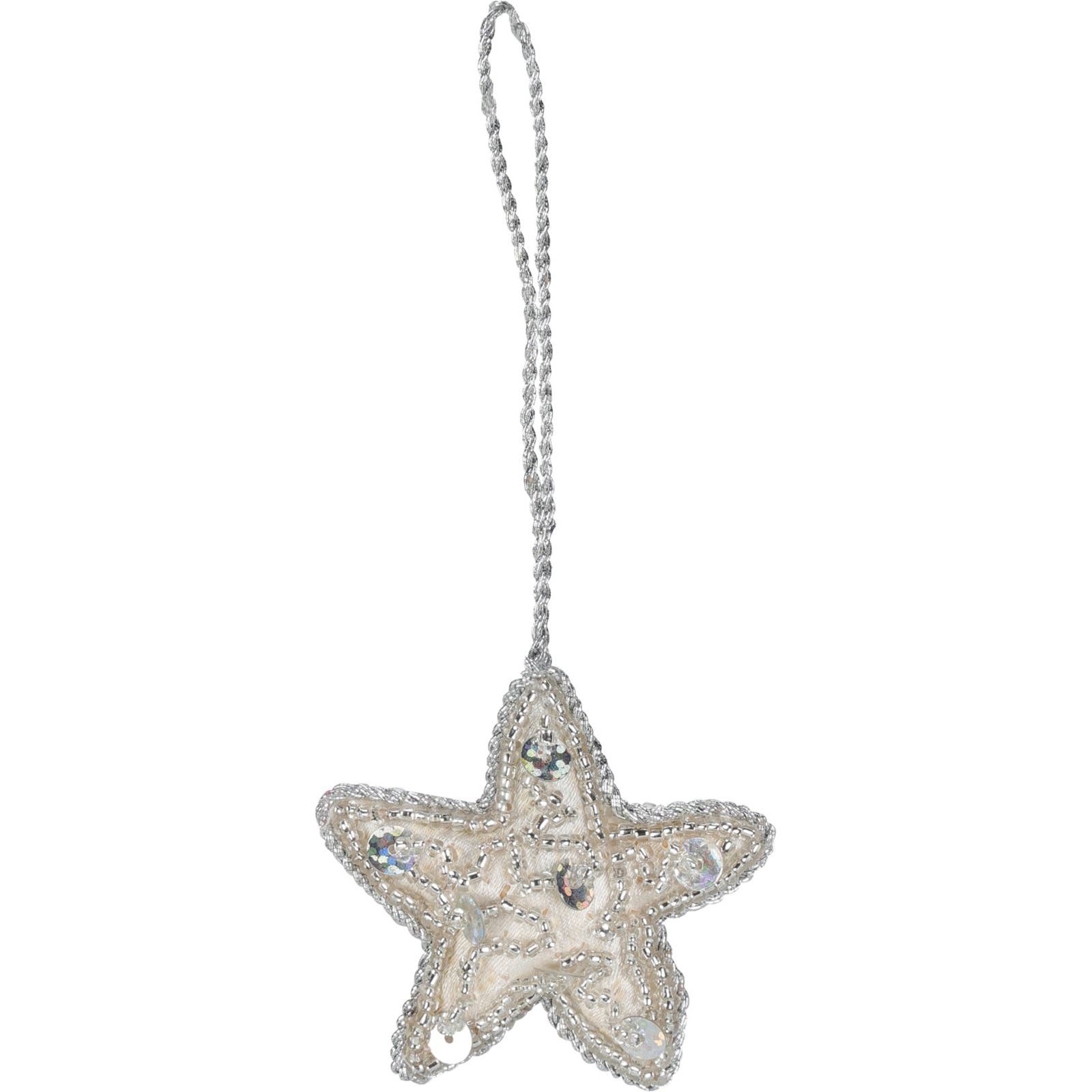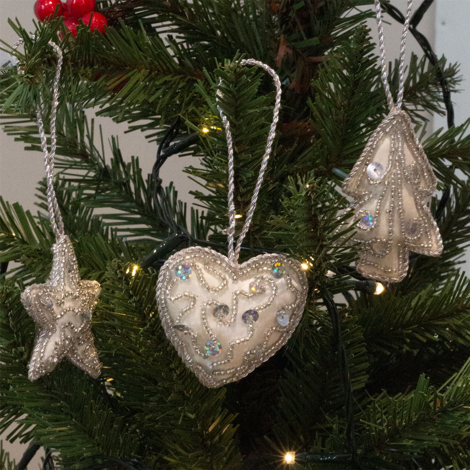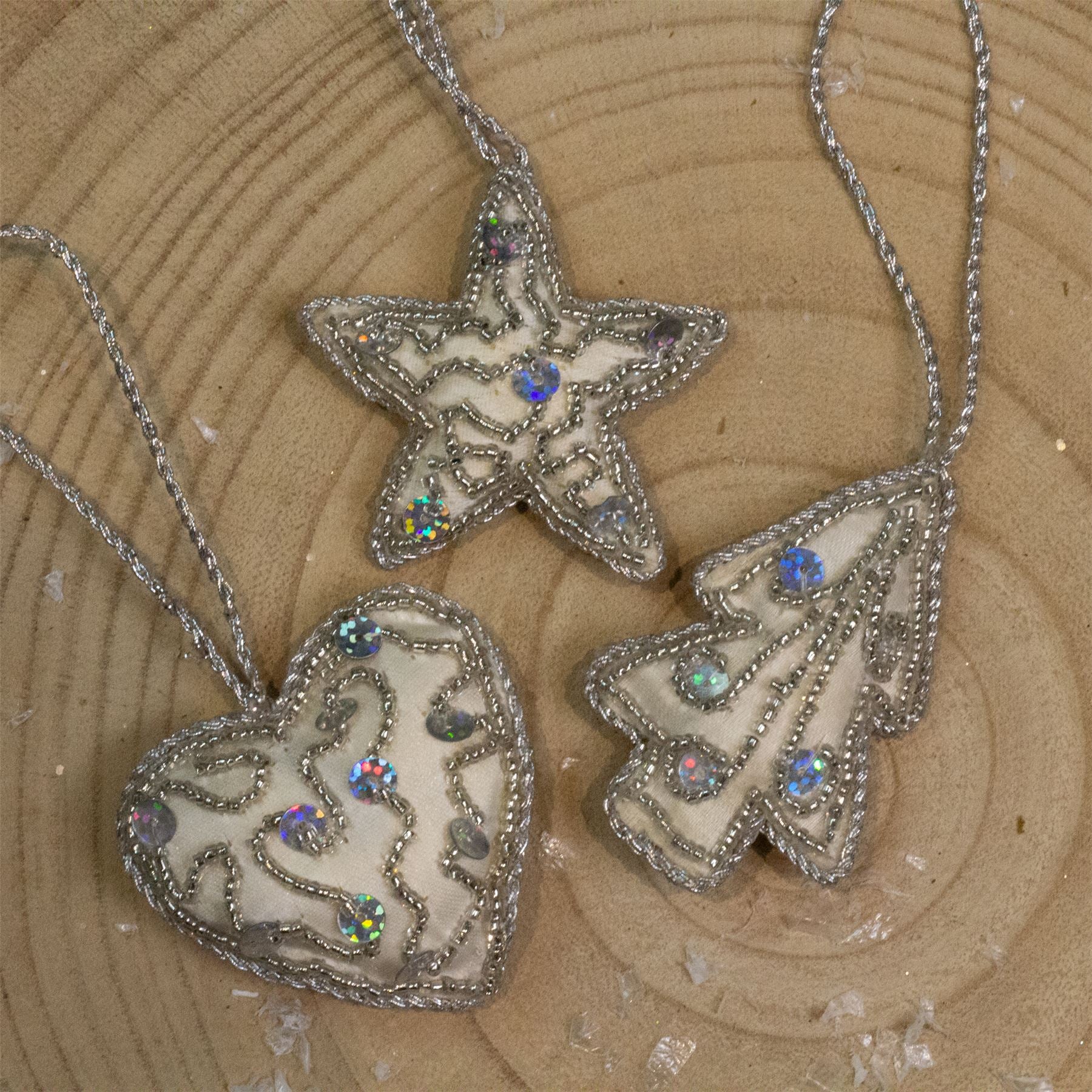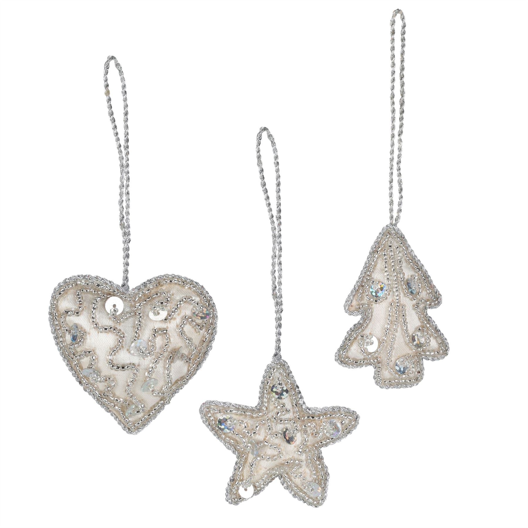 CHRISTMAS TREE ORNAMENTS | Add a touch of sophistication to your festive season with these elegant ivory ornaments. Featuring a delightful mix of tree, heart, and star shapes, each piece is adorned with sparkling silver sequins and beads for a stylish finishing touch