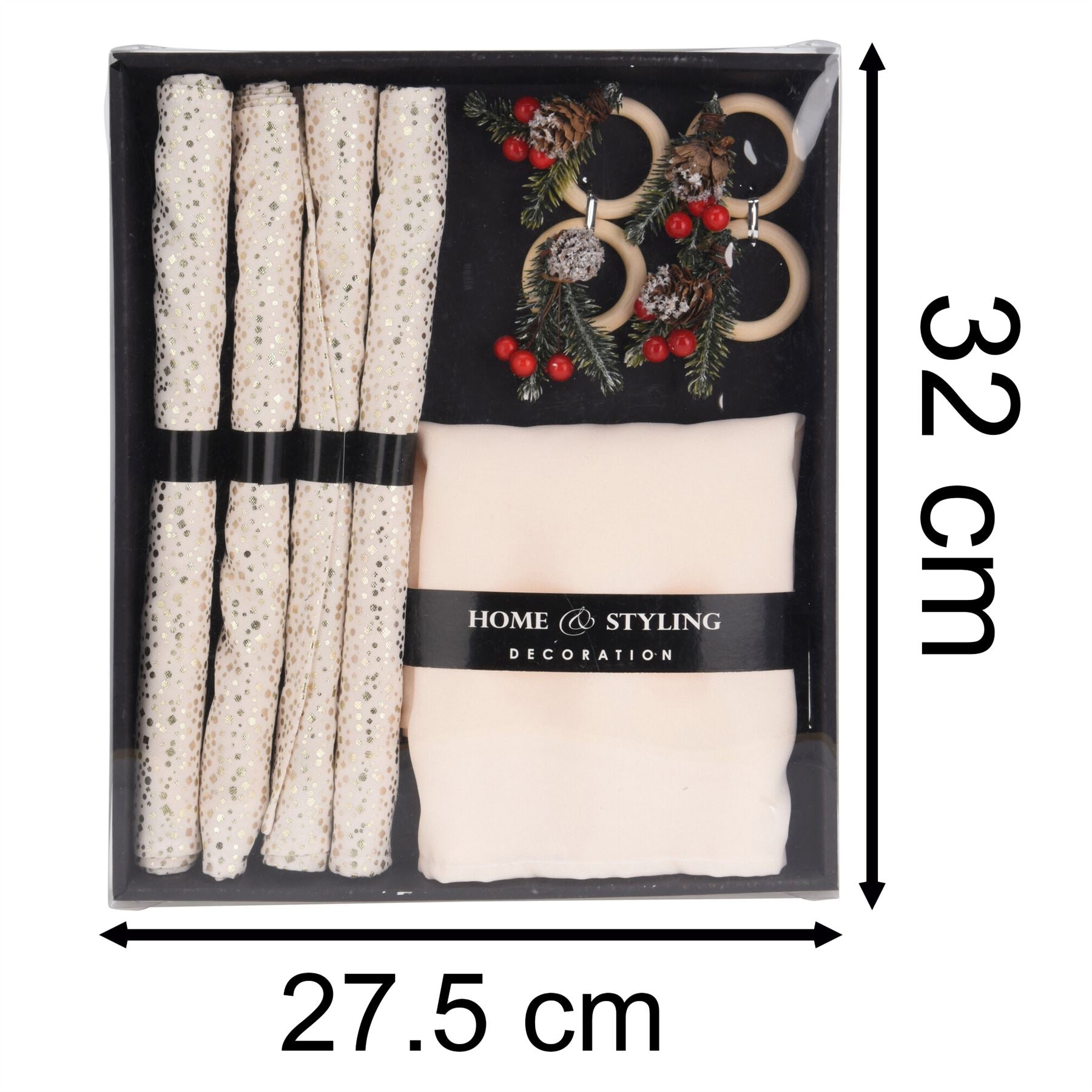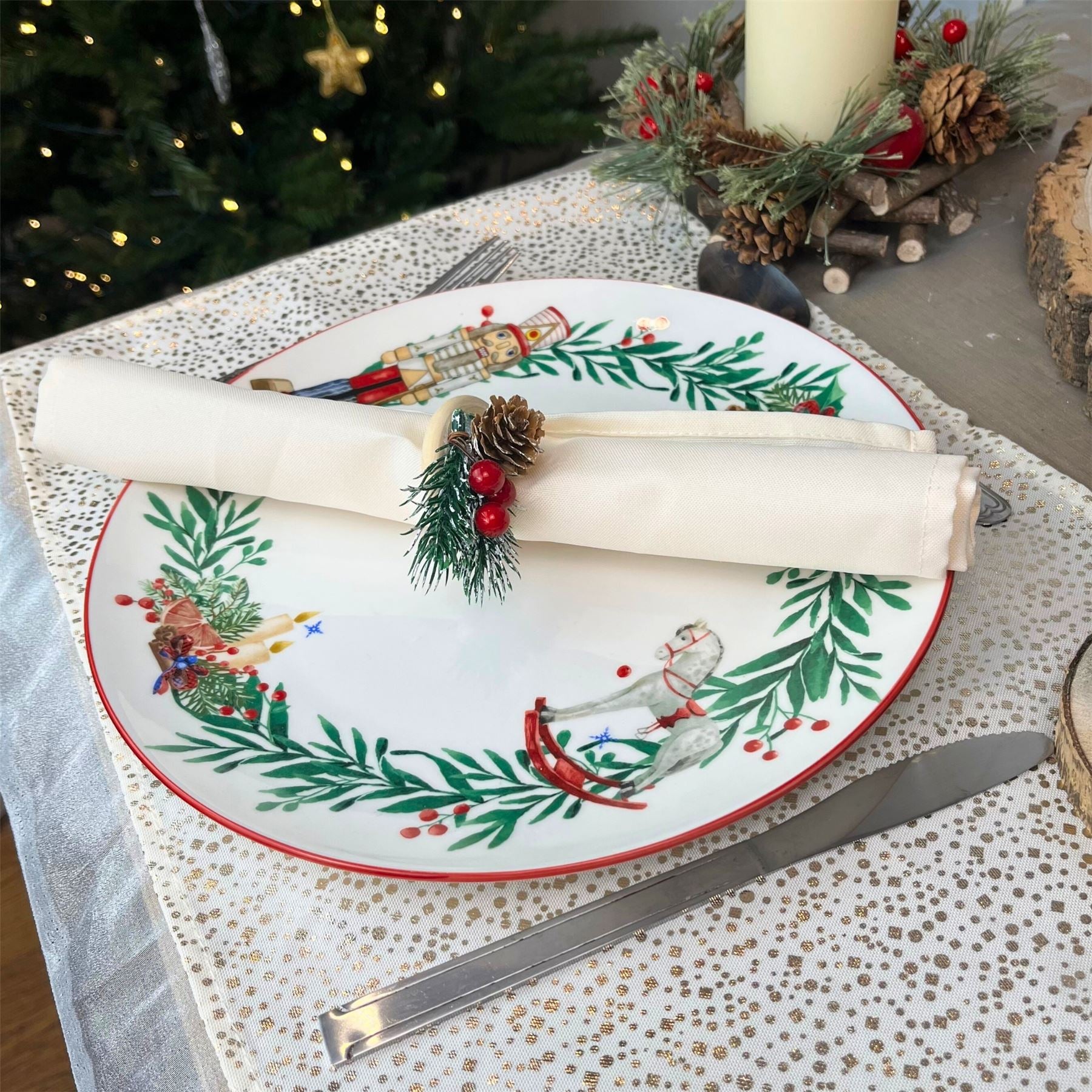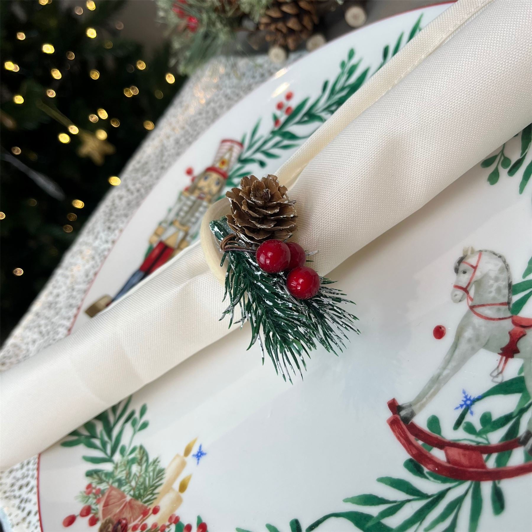Add festive cheer to your table with this 12-piece set, perfect for celebrating in style. It includes four elegant cream napkins with a champagne tint, paired with rustic wooden napkin rings adorned with holiday greenery, red berries, and pinecones for a cosy winter touch. Ideal for festive gatherings!