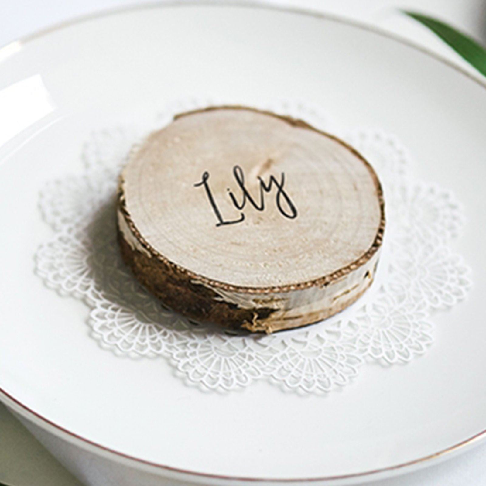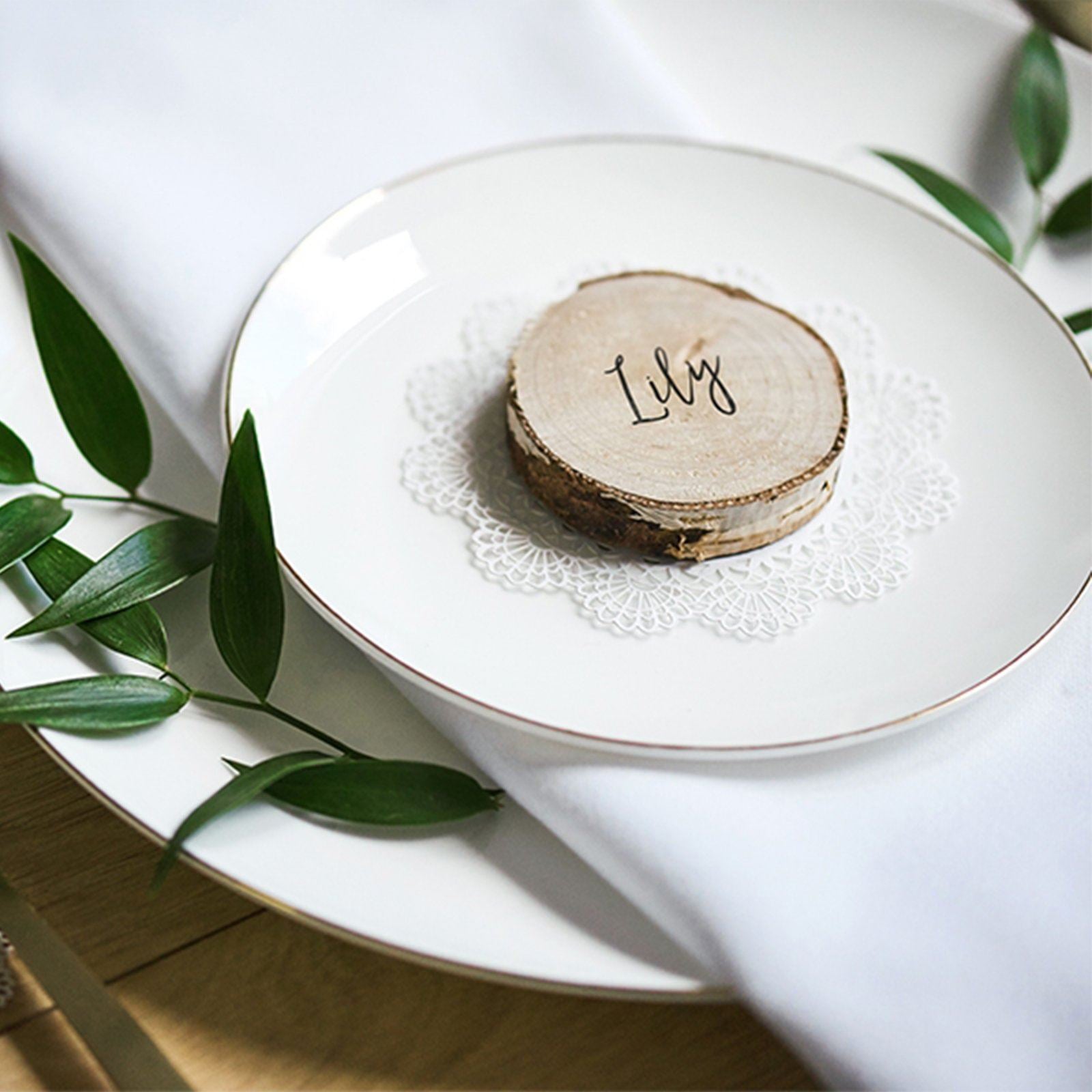 NAME PLACE SETTINGS: These natural wooden log slices make wonderful rustic wedding decorations, ideal as table numbers or place cards
