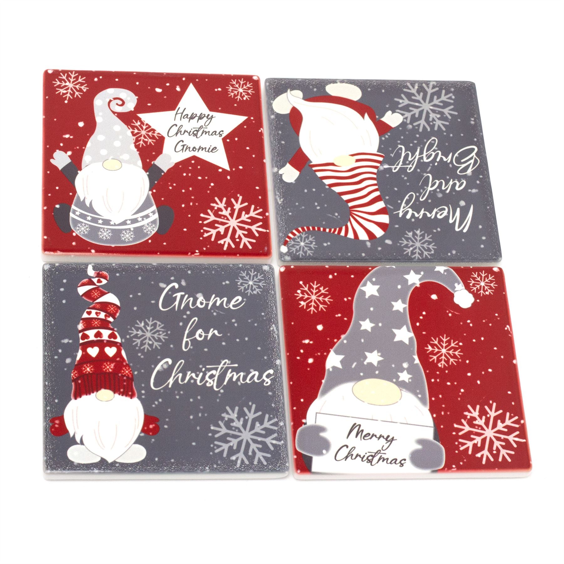 FESTIVE GNOME FUN | Bring holiday cheer to your table with this set of four charming Gonk gnome coasters, each featuring playful Christmas messages