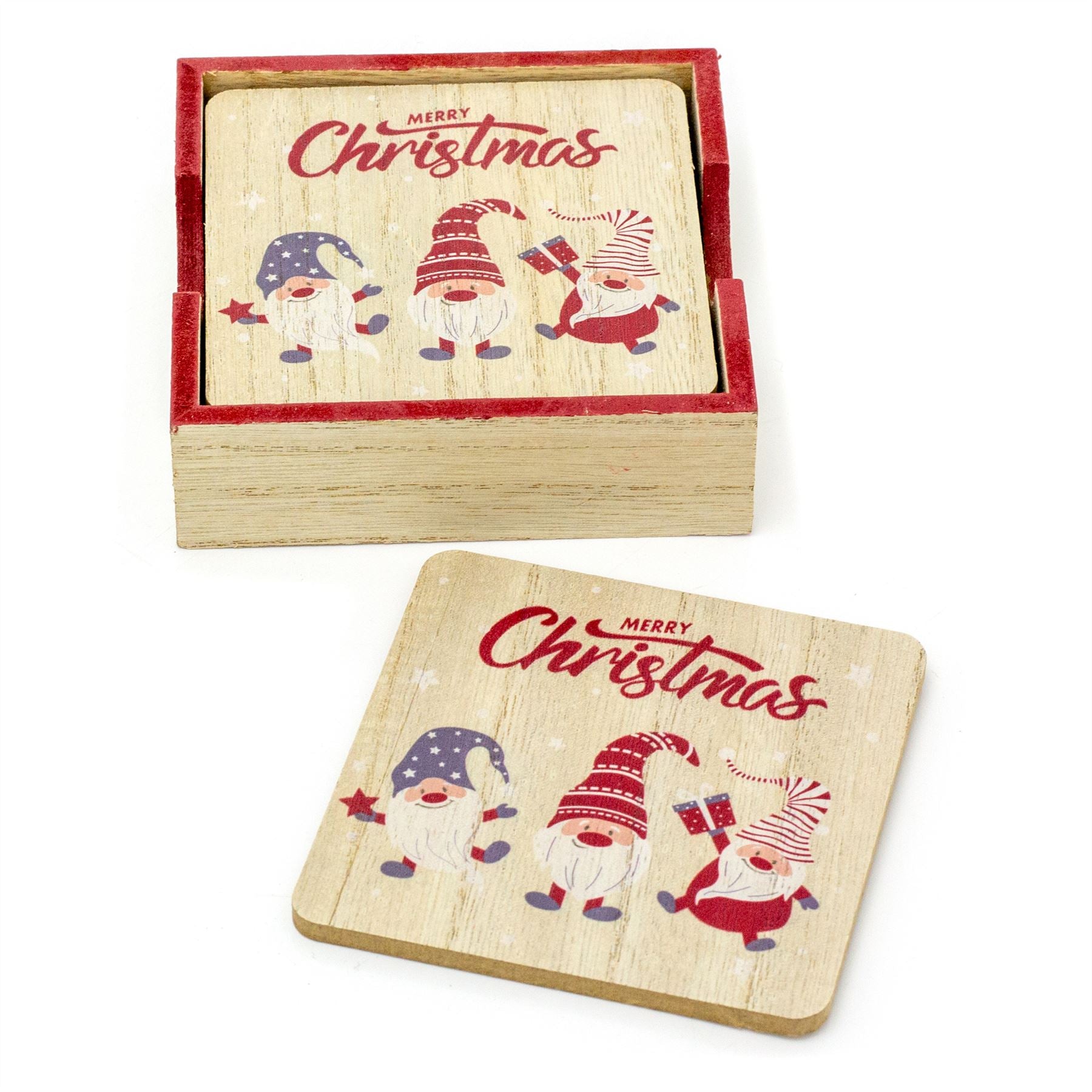 Set Of 6 Christmas Gonk Coasters | 6 Wooden Merry Christmas Coaster And Holder