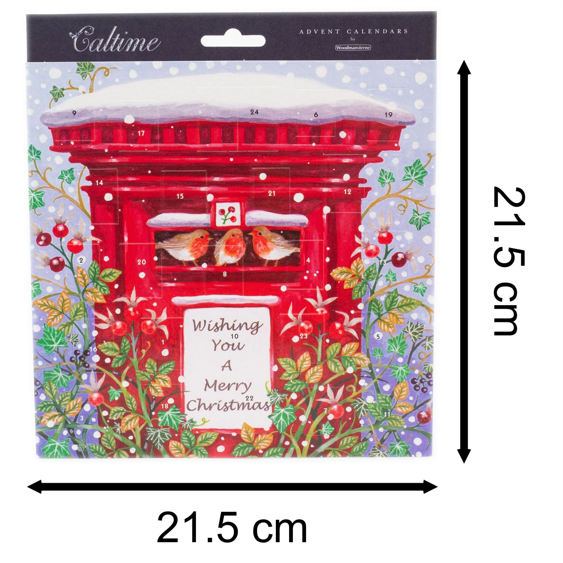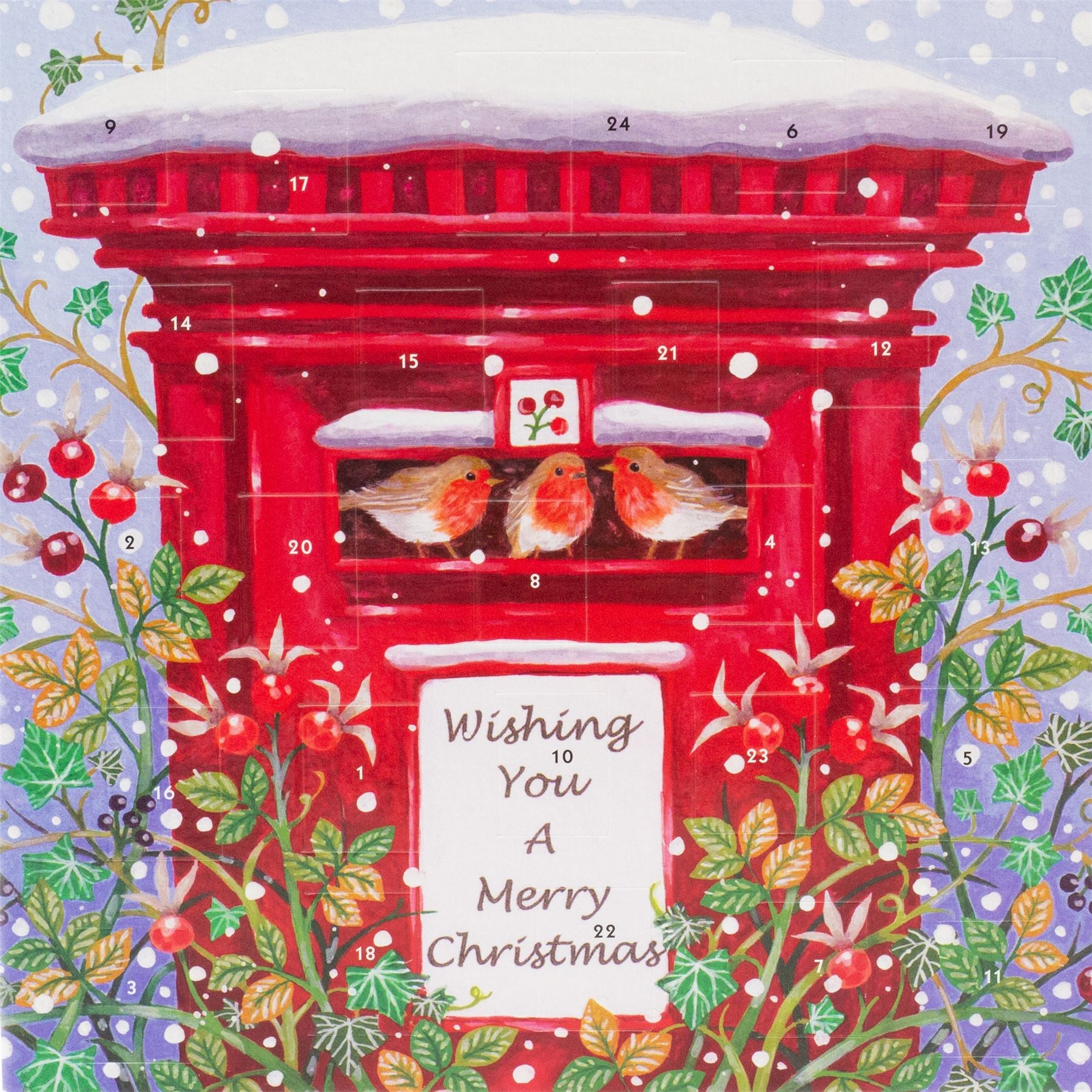 ADVENT CALENDAR | Nestled within a snowy landscape adorned with holly and ivy, a trio of charming robin redbreasts find their perch on a vibrant red post box. The box bears the heartfelt message "Wishing You a Merry Christmas," encapsulating the joy and warmth of this magical time of year