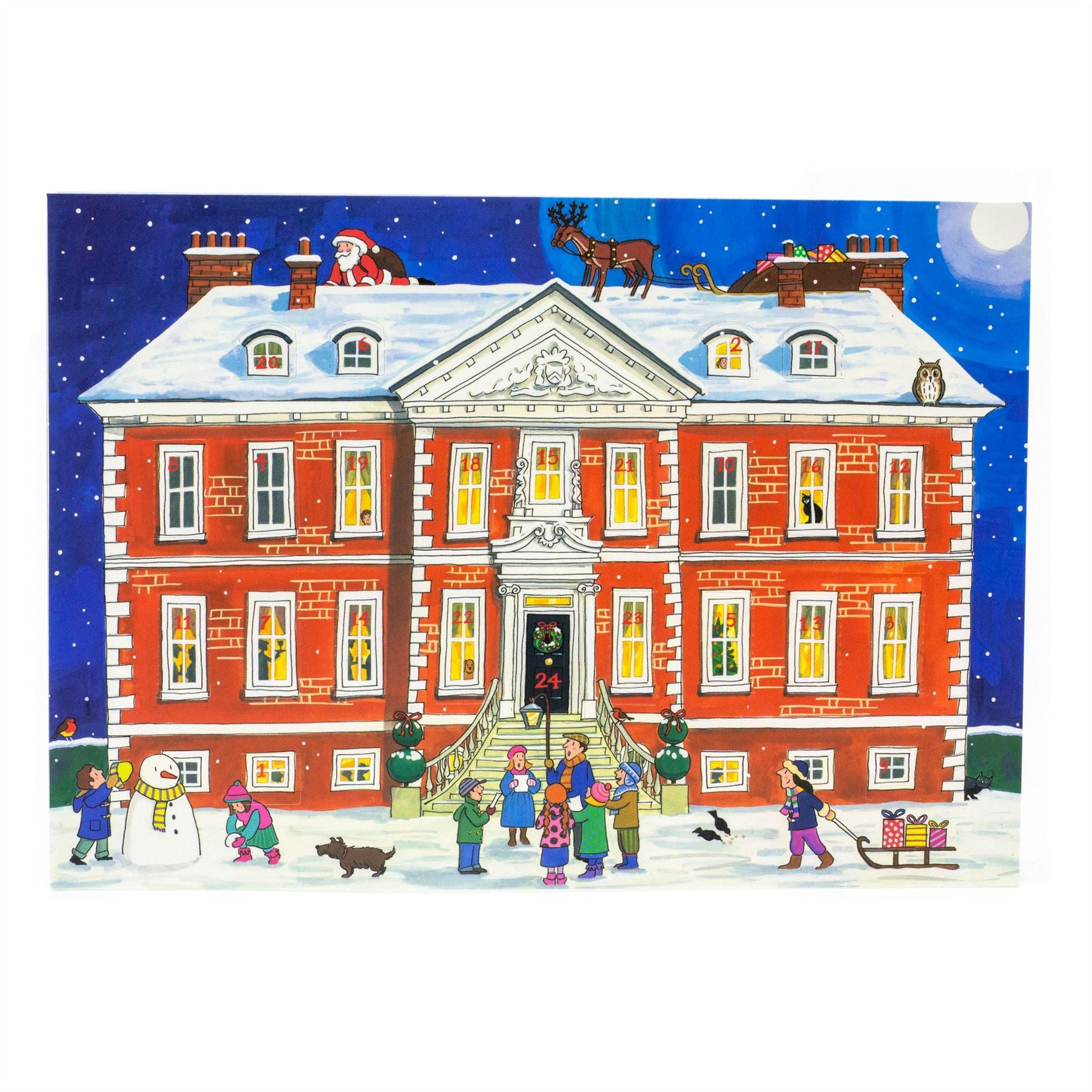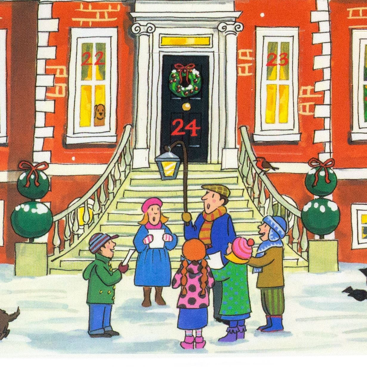 CHRISTMAS ADVENT CALENDAR | Bring the magic of Christmas to life with our Country House Advent Card. The card features a whimsical winter scene at a beautifully decorated country house, where carol singers fill the air with music, children build a snowman, and Santa sneaks in to fill the stockings with presents