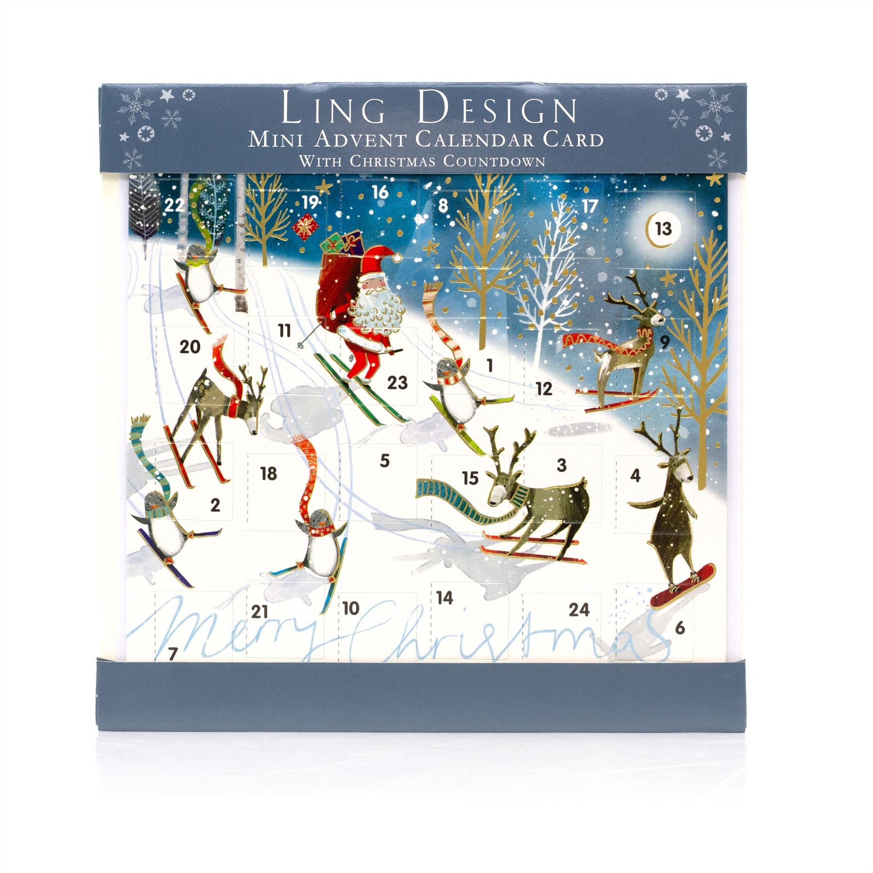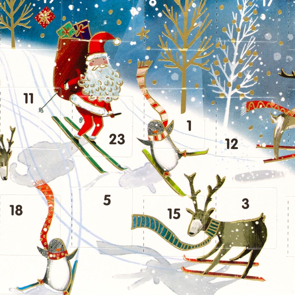 A playful Advent greetings card with 24 windows, featuring Santa and his reindeer skiing and sledding through a snowy wonderland under twinkling stars