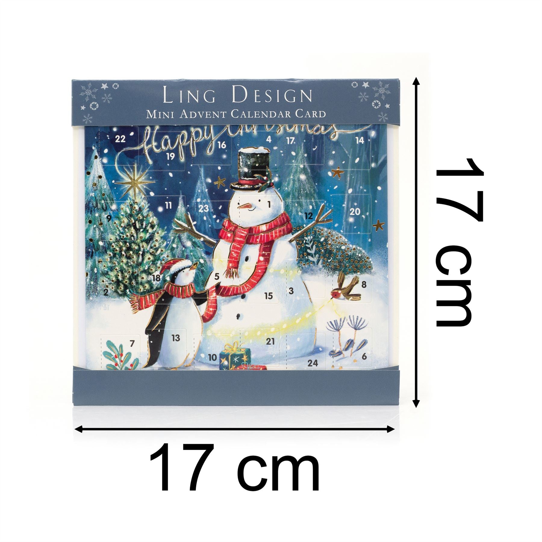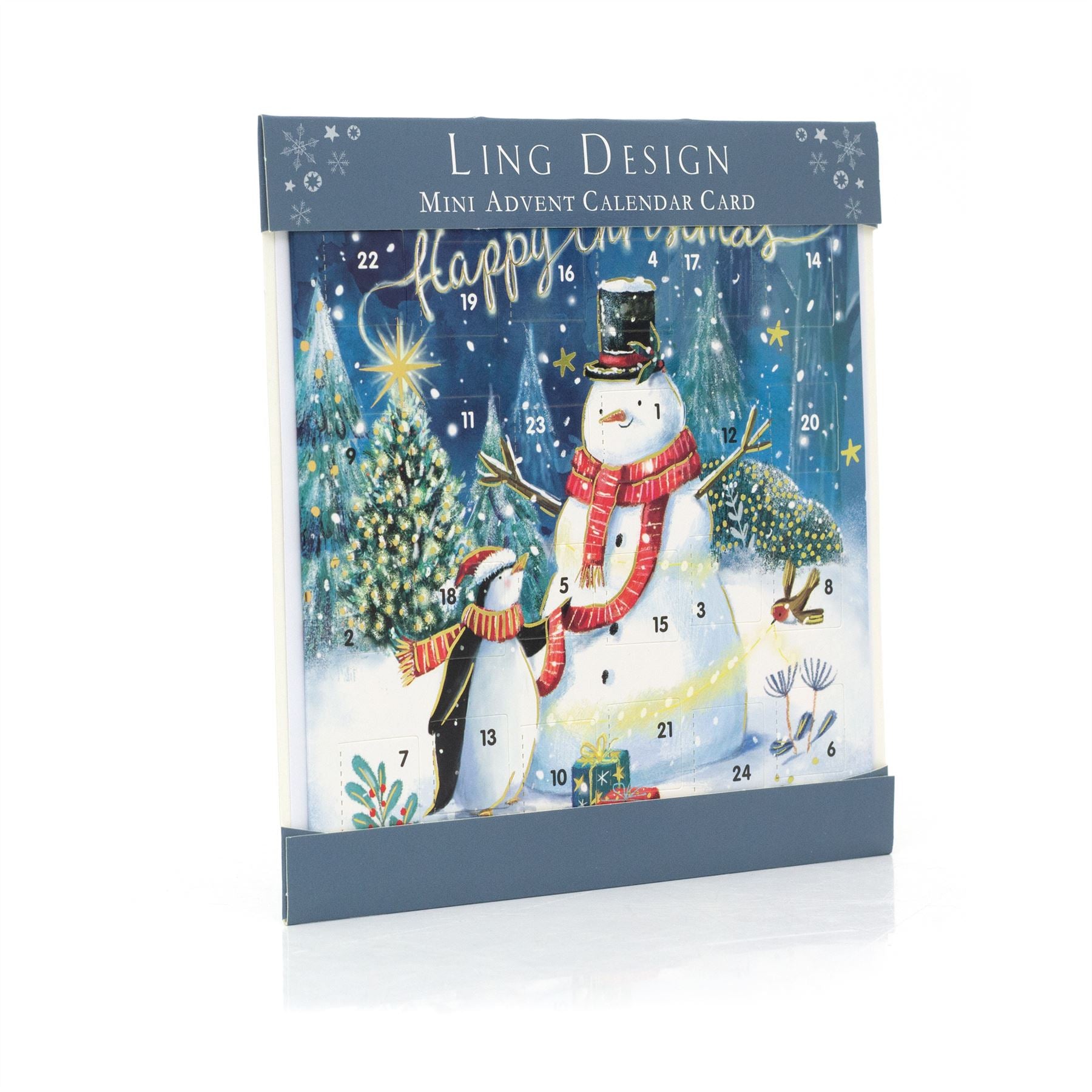 Countdown to Christmas with this snowman and penguin advent greetings card, featuring 24 festive windows, snowy charm and a thoughtful message inside