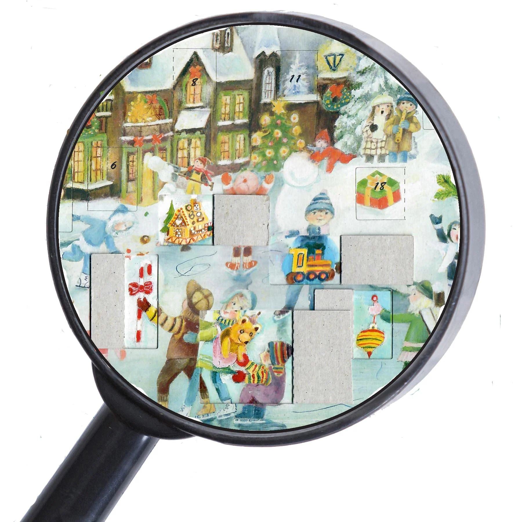 Experience the magic of winter with this glittery advent calendar. Open each door to discover ice skaters and festive surprises in a snowy castle scene, perfect for children and families