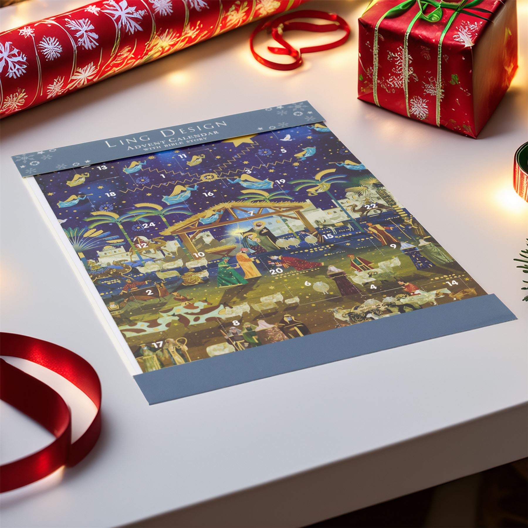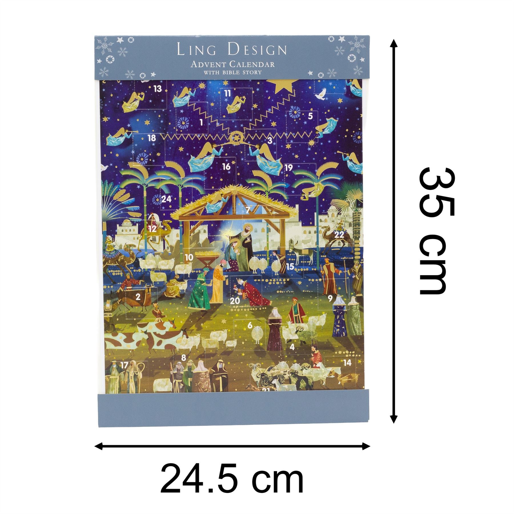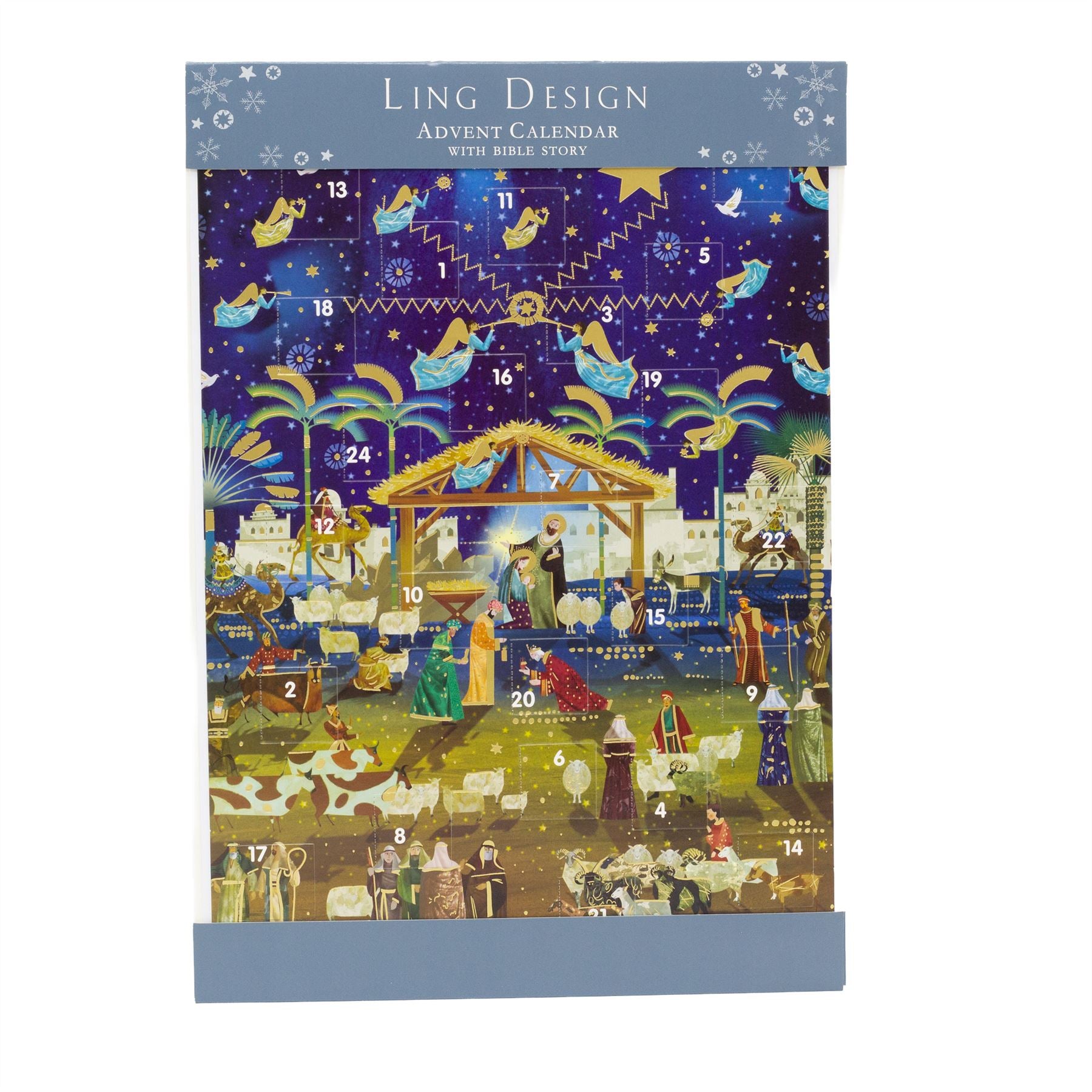 Celebrate Christmas with this Nativity advent calendar, featuring 24 doors, golden foiled details, and a starry angel-filled night sky