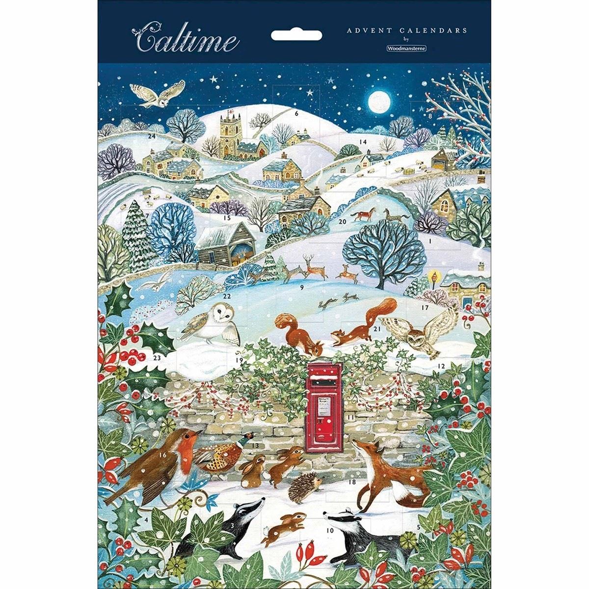 Celebrate the countdown to Christmas with this delightful Over the Fields advent calendar, featuring a snowy village scene with woodland animals and a charming red letterbox
