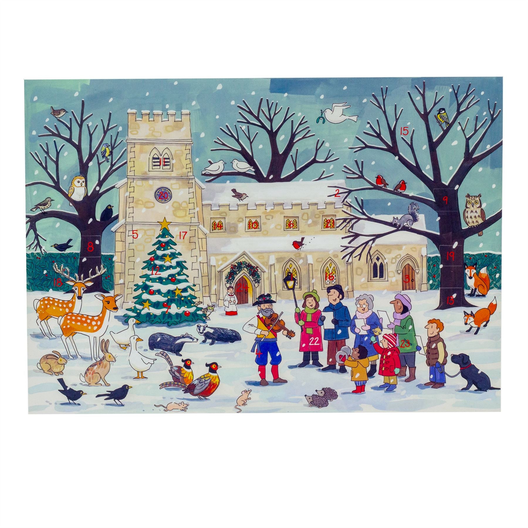 Celebrate Christmas with our Winter Wildlife Advent Calendar, featuring a picturesque English church and England's iconic winter animals. This traditional, chocolate-free advent calendar reveals a festive scene behind each window, Perfect as a gift or as