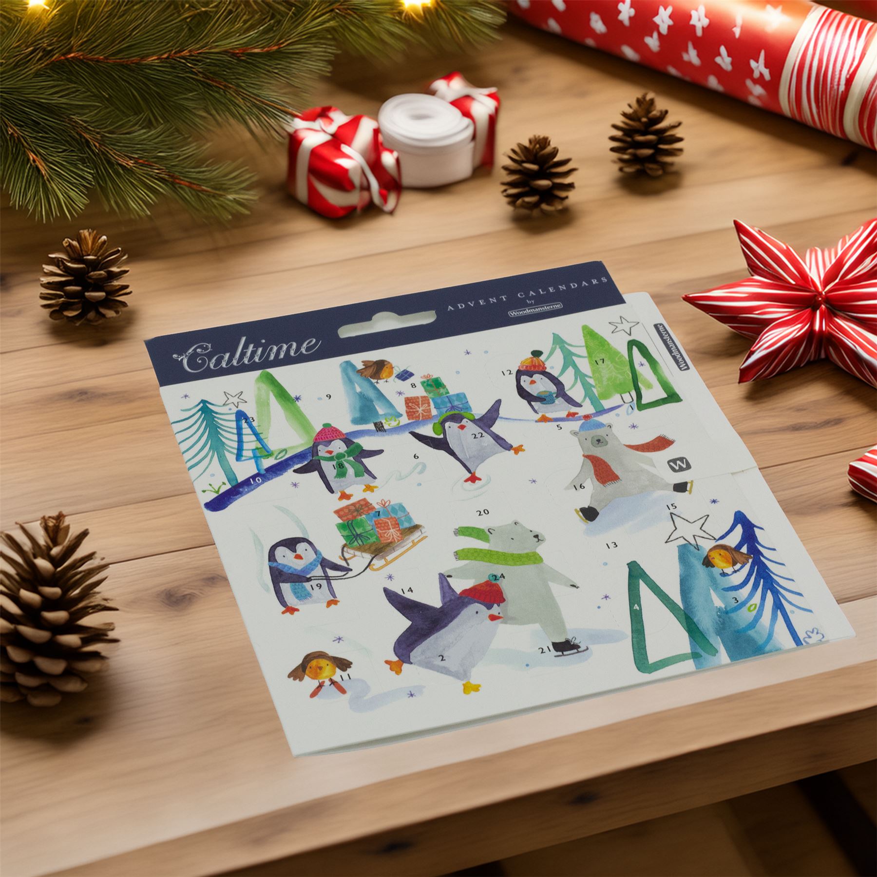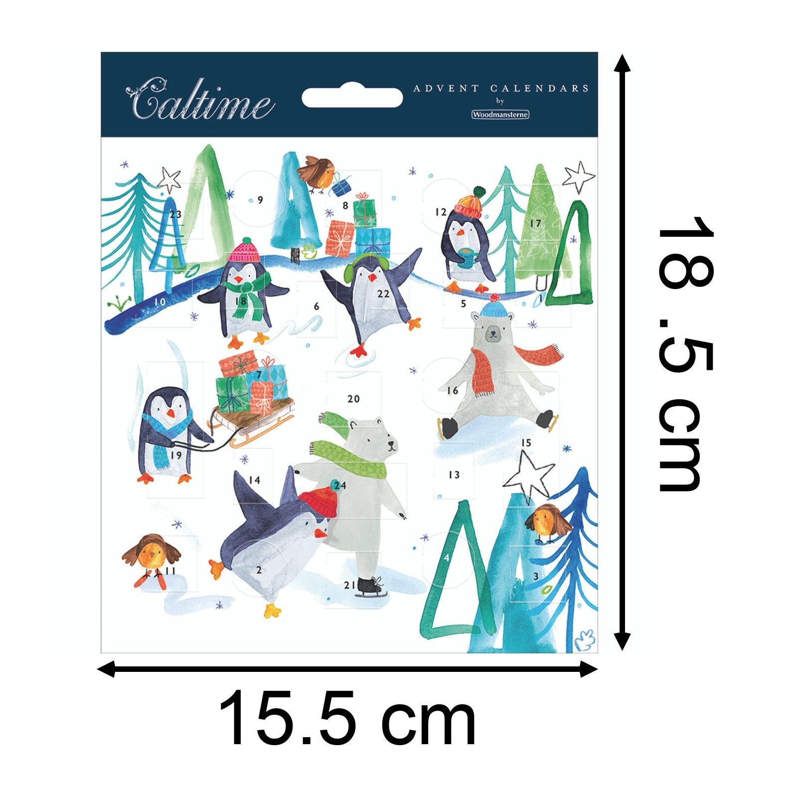A WHIMSICAL WINTER SCENE | Delight in this playful penguin and polar bear advent card, with 24 surprise doors and a sparkling winter scene, perfect for sharing festive cheer