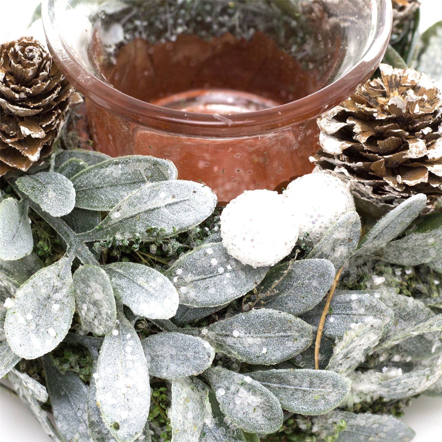 CHRISTMAS TEALIGHT HOLDER: This pretty tealight candle holder has a festive design featuring beautiful artificial mistletoe and rustic pine cones, all topped off with a dusting of glittery snow, a wonderful Christmas candle pot to make your home feel a bit more cosy over the winter months, use with Christmas scented tealights to complete the ambience