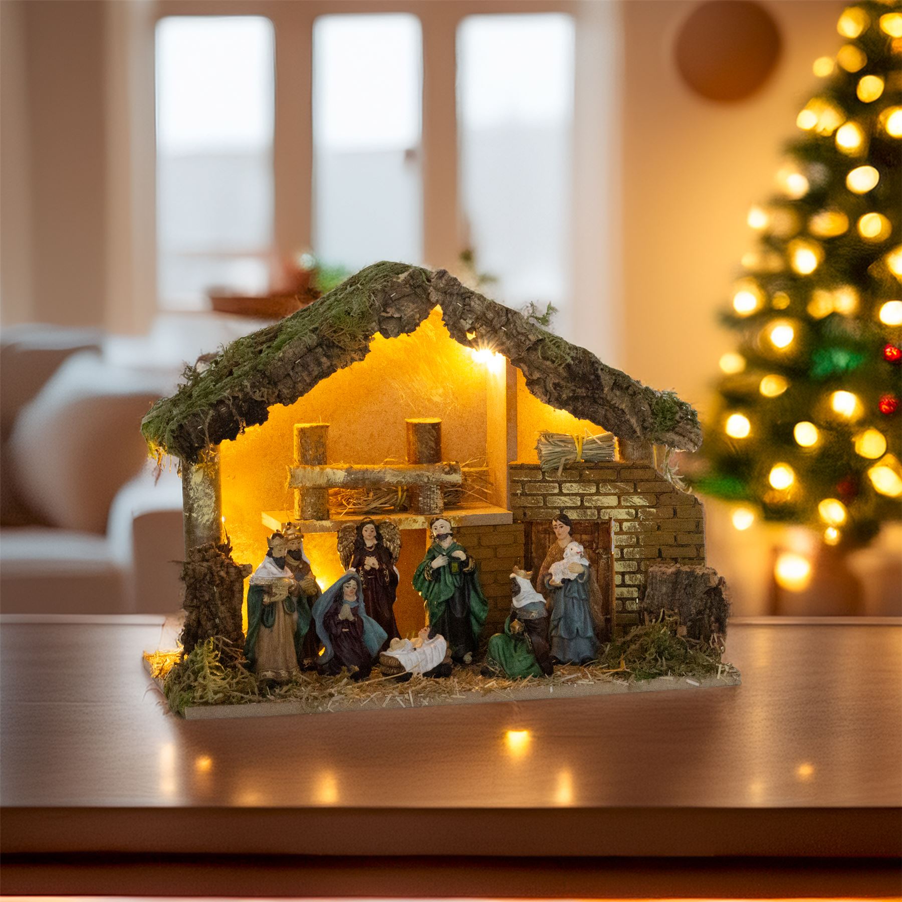 Add warmth and tradition to your Christmas with this LED wooden nativity stable. Crafted with moss and bark, featuring a light string and timer for a cosy festive glow