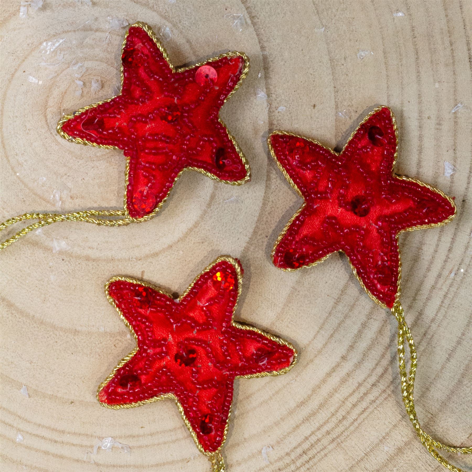 CHRISTMAS TREE ORNAMENTS | Add a splash of festive sparkle to your Christmas tree with these stunning red star-shaped ornaments. Each piece is elegantly covered in sparkling sequins and beads, adding a touch of festive cheer to your Christmas tree