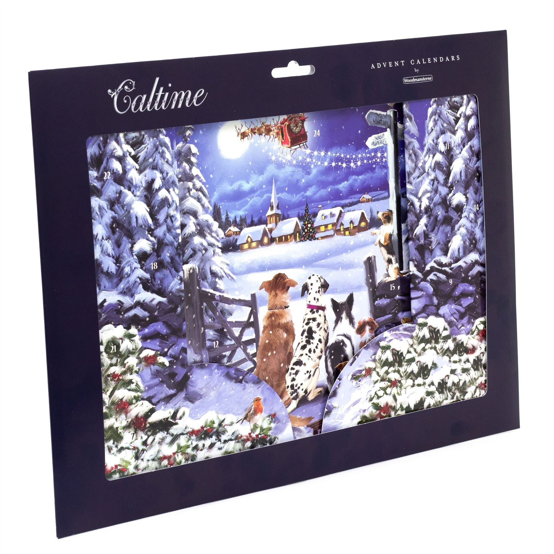 ADVENT CALENDAR | Transport yourself to a snowy wonderland, where dogs gather in anticipation of Father Christmas soaring above. Delight in the detailed scene, complete with a picturesque village, a quaint church, and a starlit Christmas sky