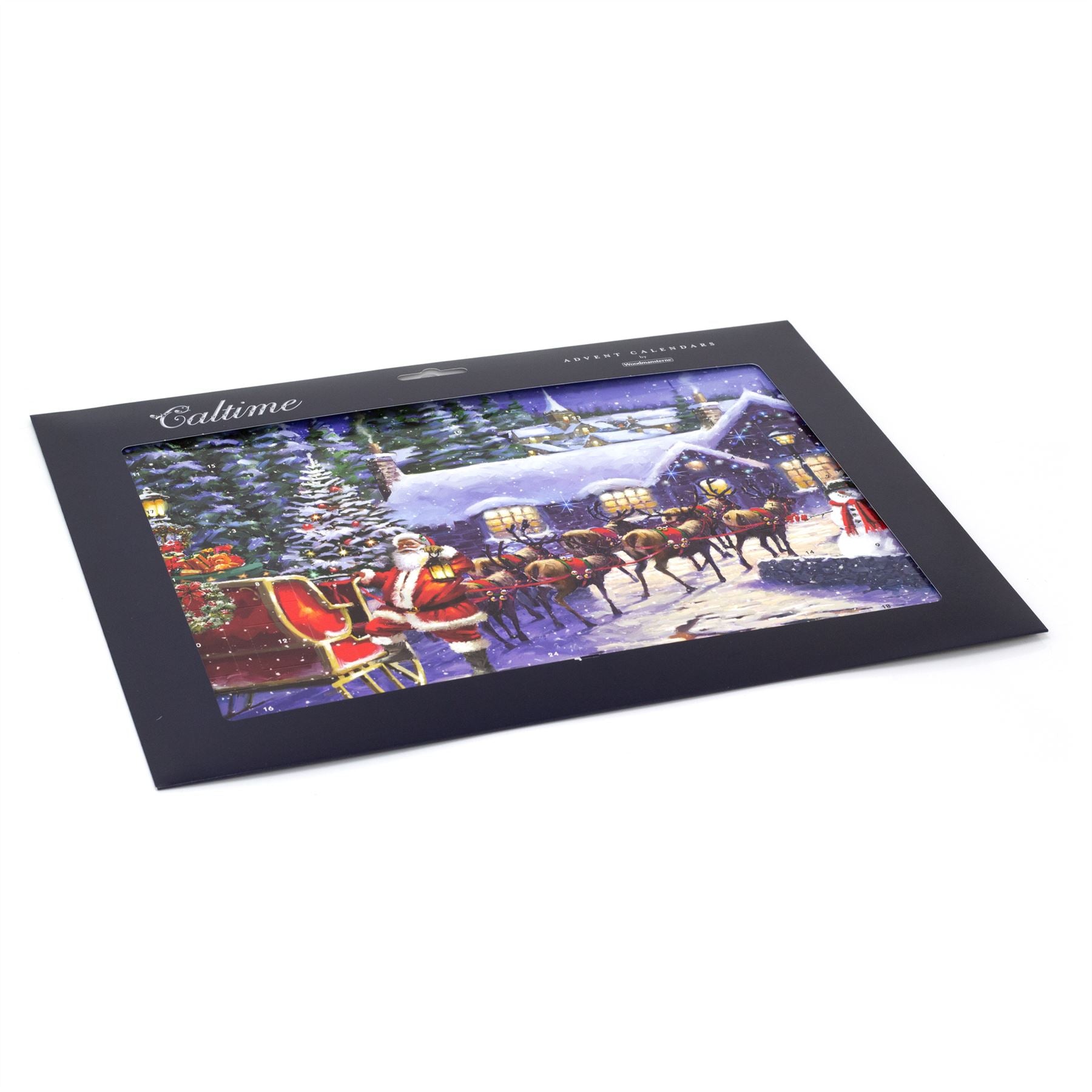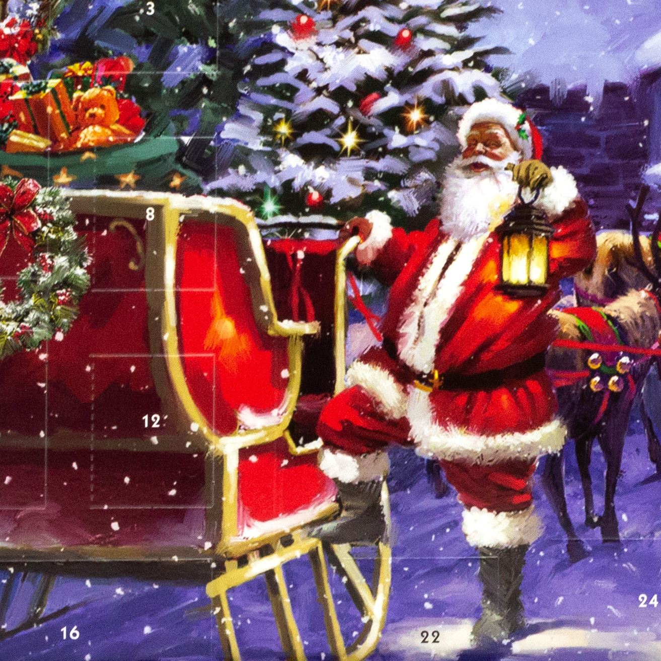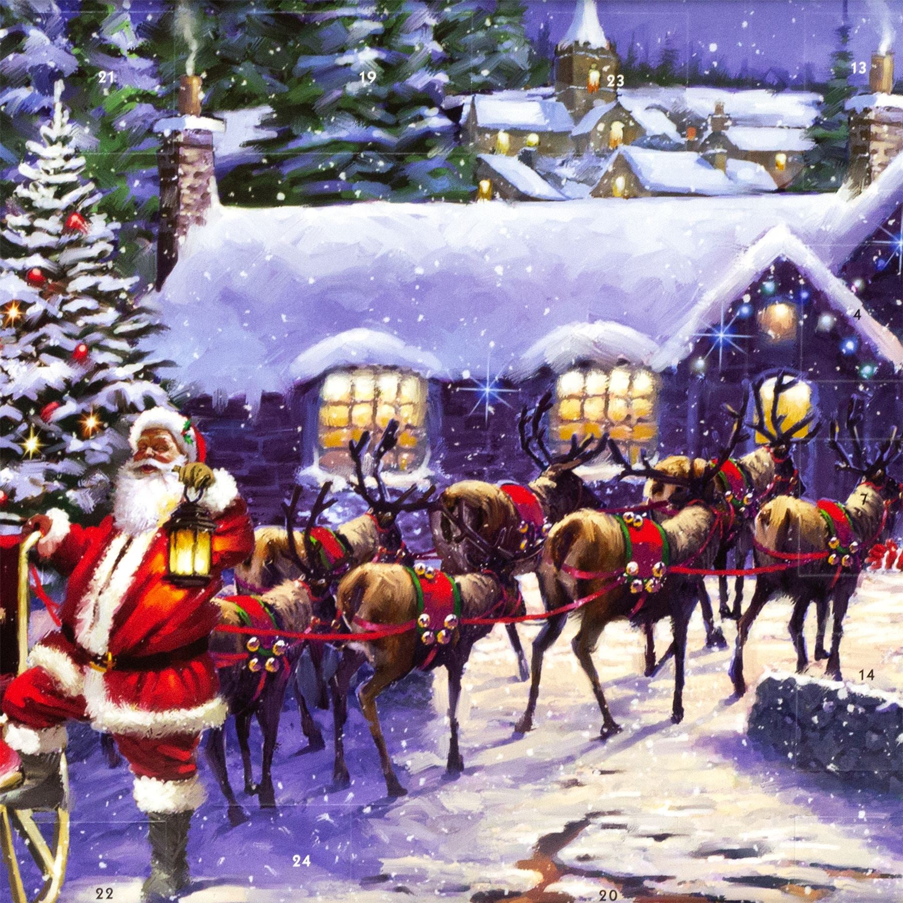 ADVENT CALENDAR | A captivating advent calendar with a charming scene of a snowy village nestled amongst towering trees, where a jolly Santa Claus and his faithful reindeer lead a sleigh brimming with joyous presents