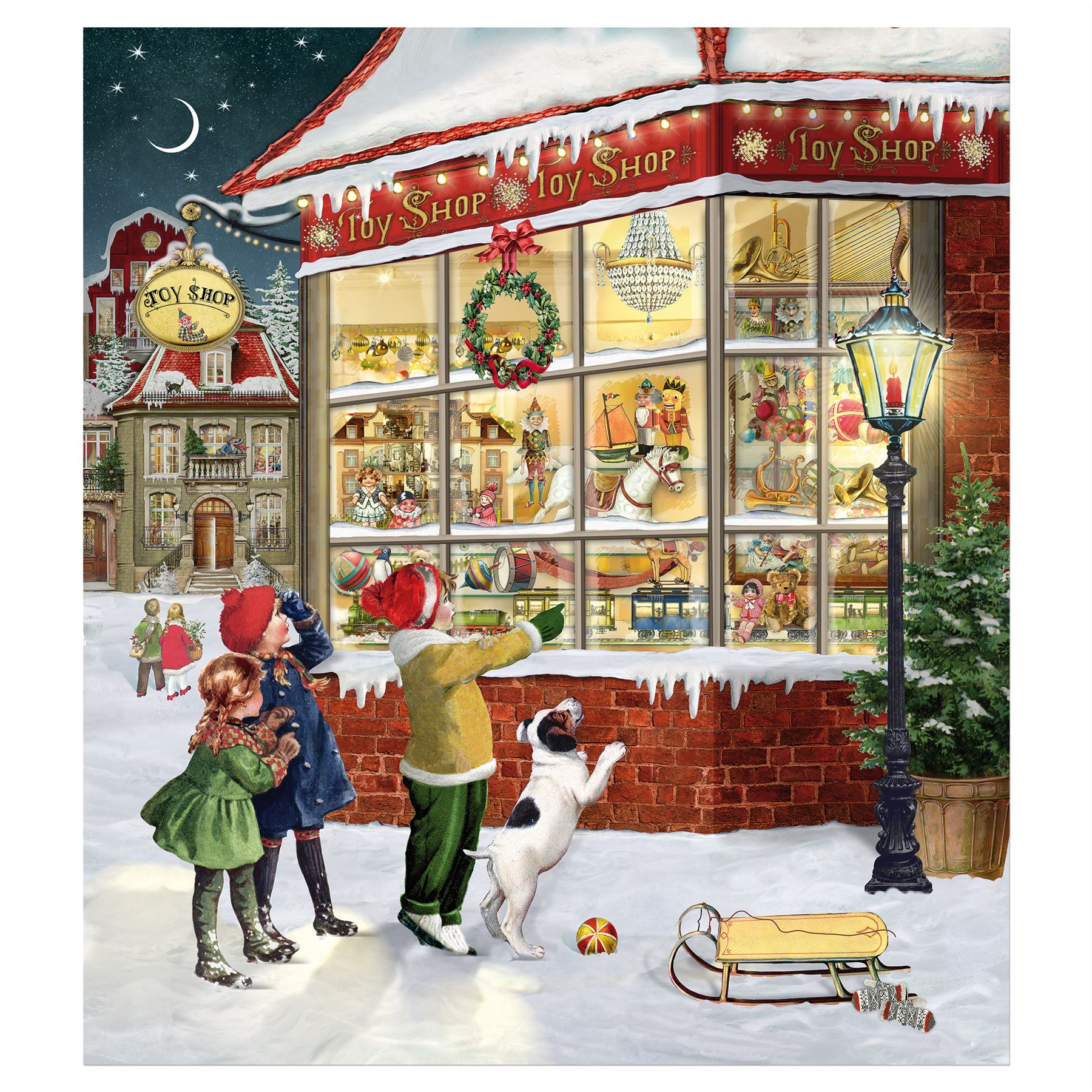 PICTURE ADVENT CALENDAR | Elevate your Christmas decor with "The Toy Shop at Christmas" advent calendar, a classic and glitter-adorned calendar that brings the magic of the season to life