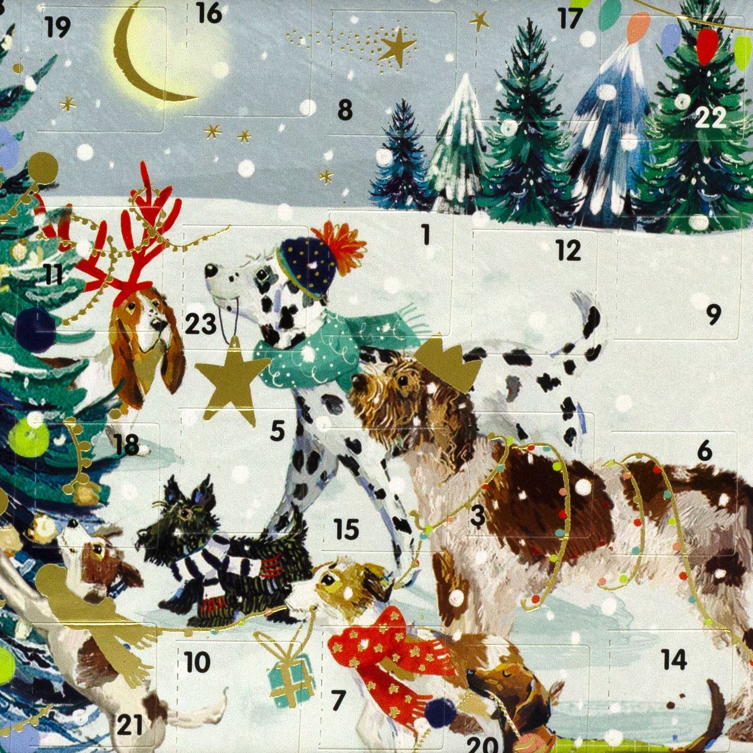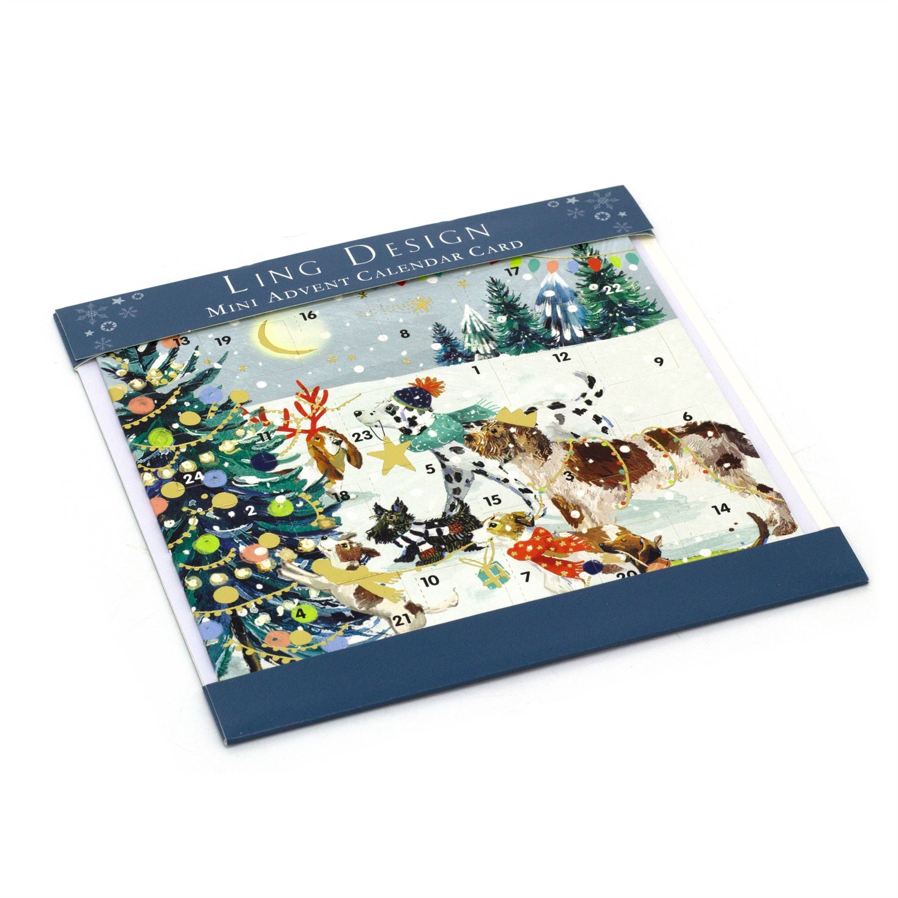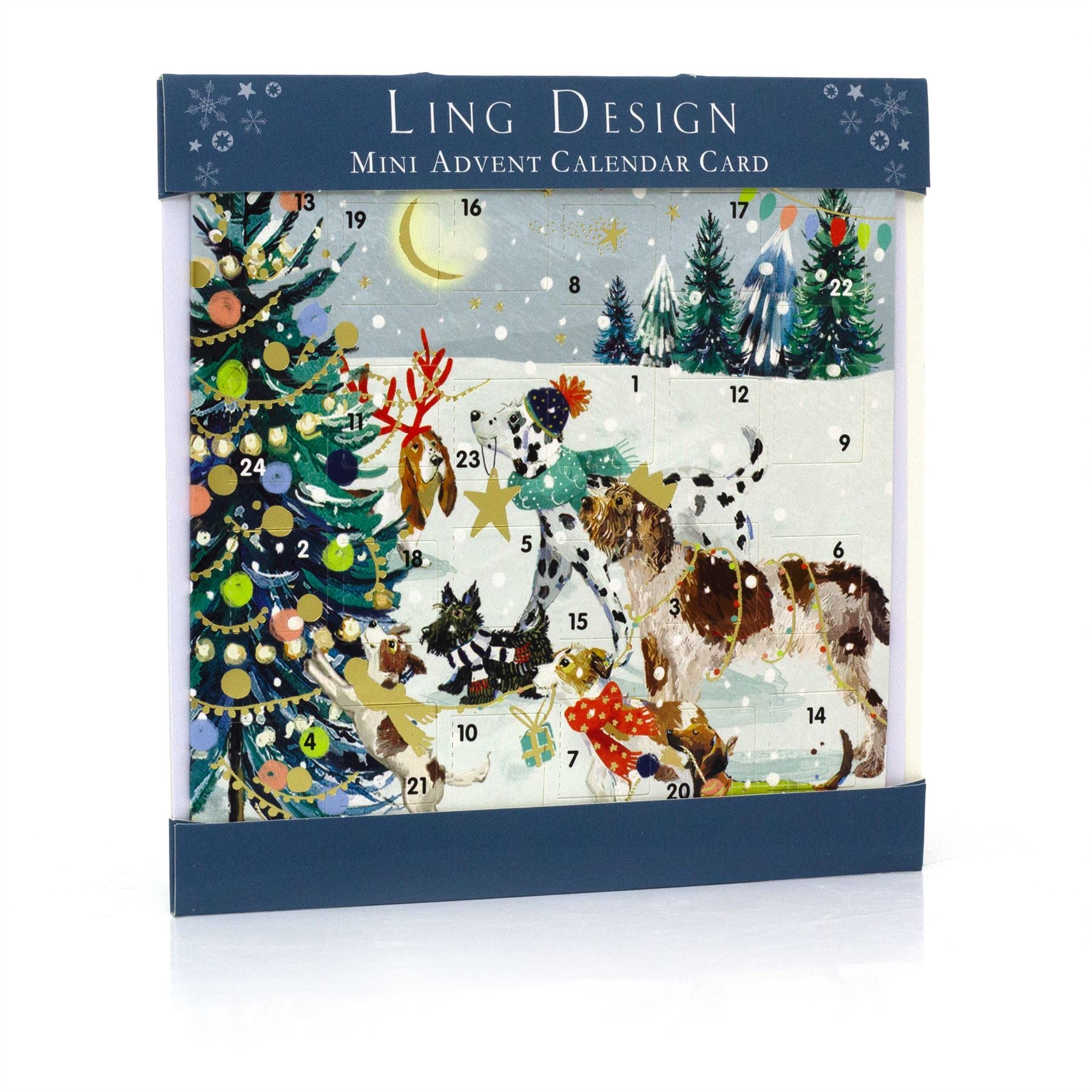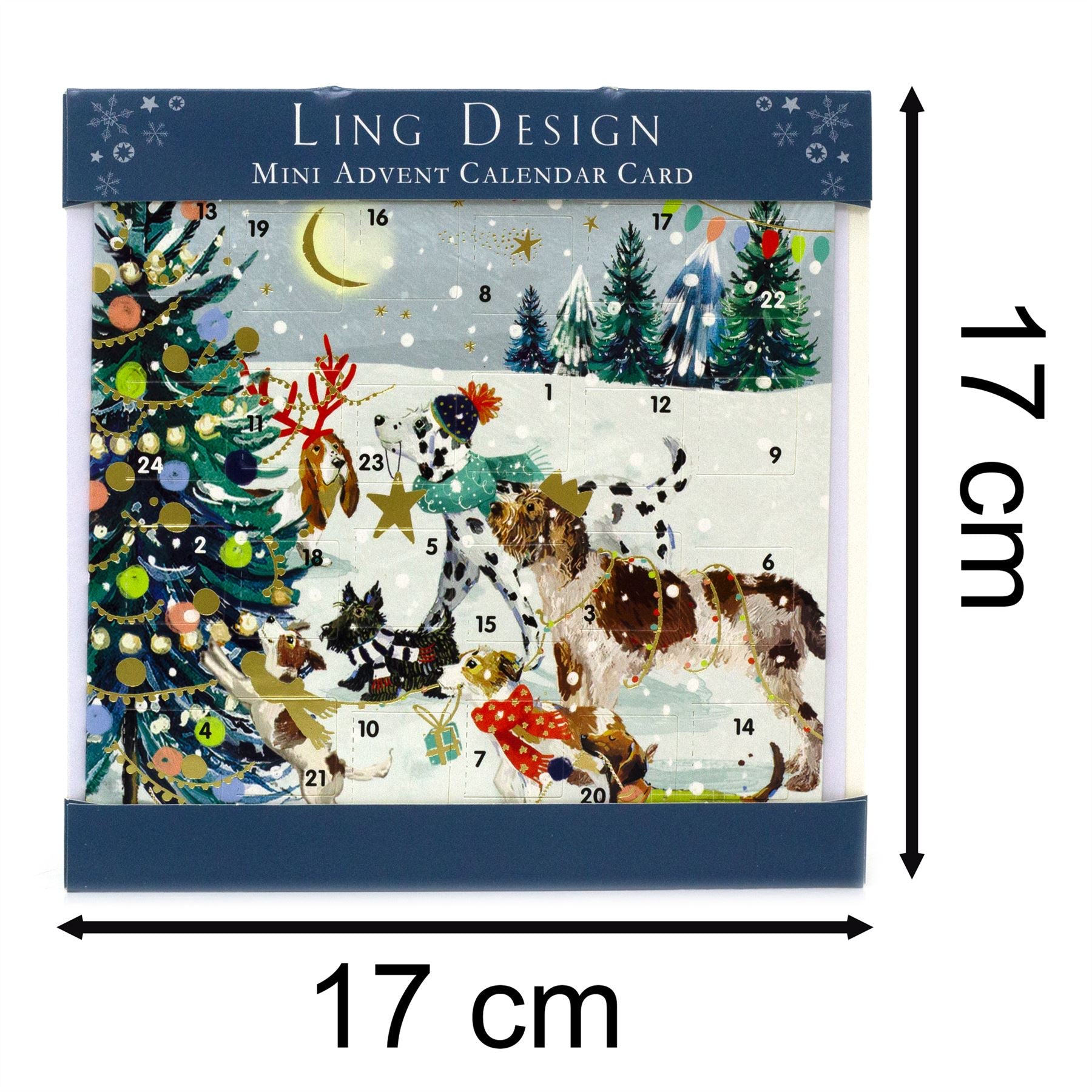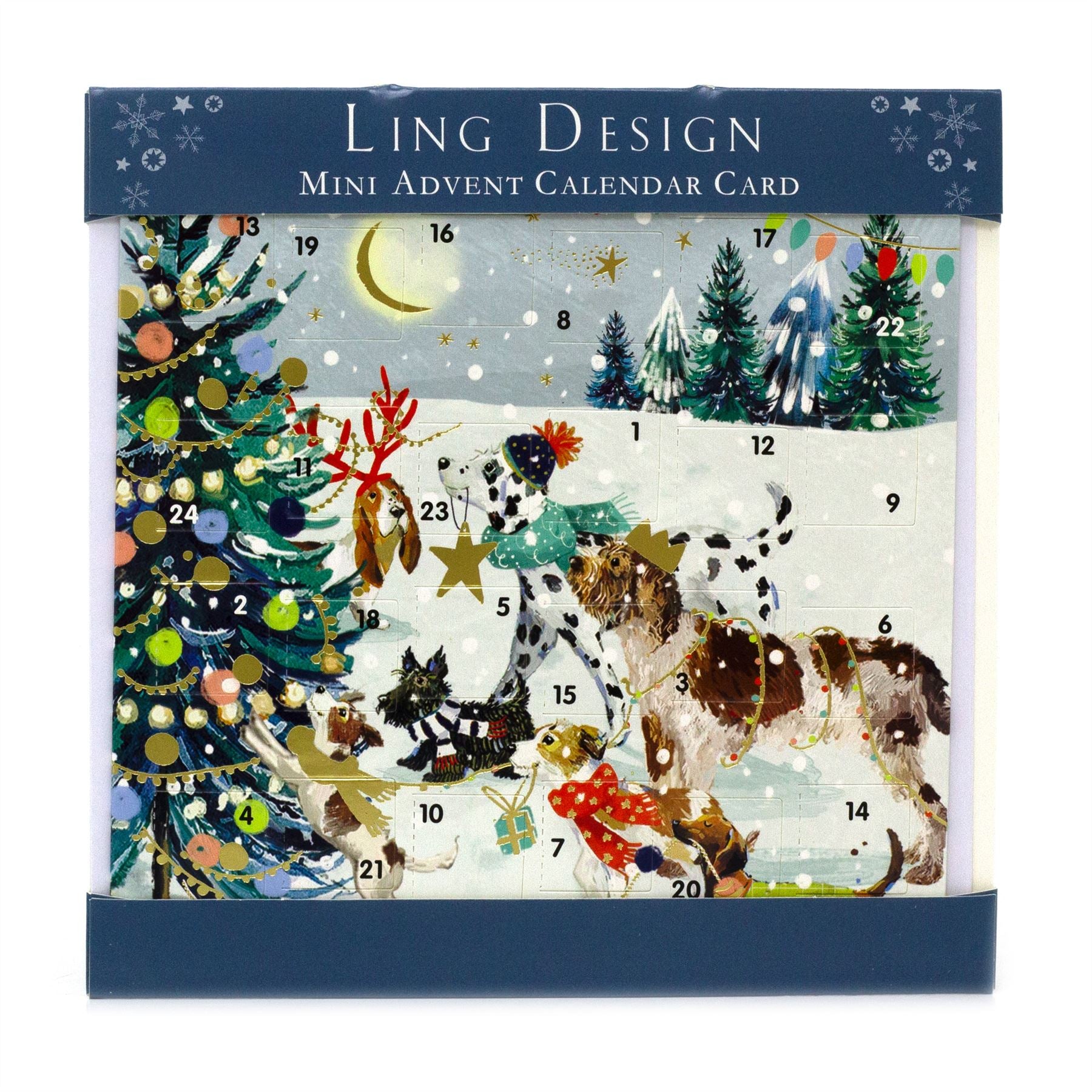 CHRISTMAS ADVENT CALENDAR | Celebrate the festive season with the Christmas Time Advent Calendar Greetings Card, featuring a snowy night where playful dogs, wrapped in scarves, joyfully gather around to decorate the Christmas tree