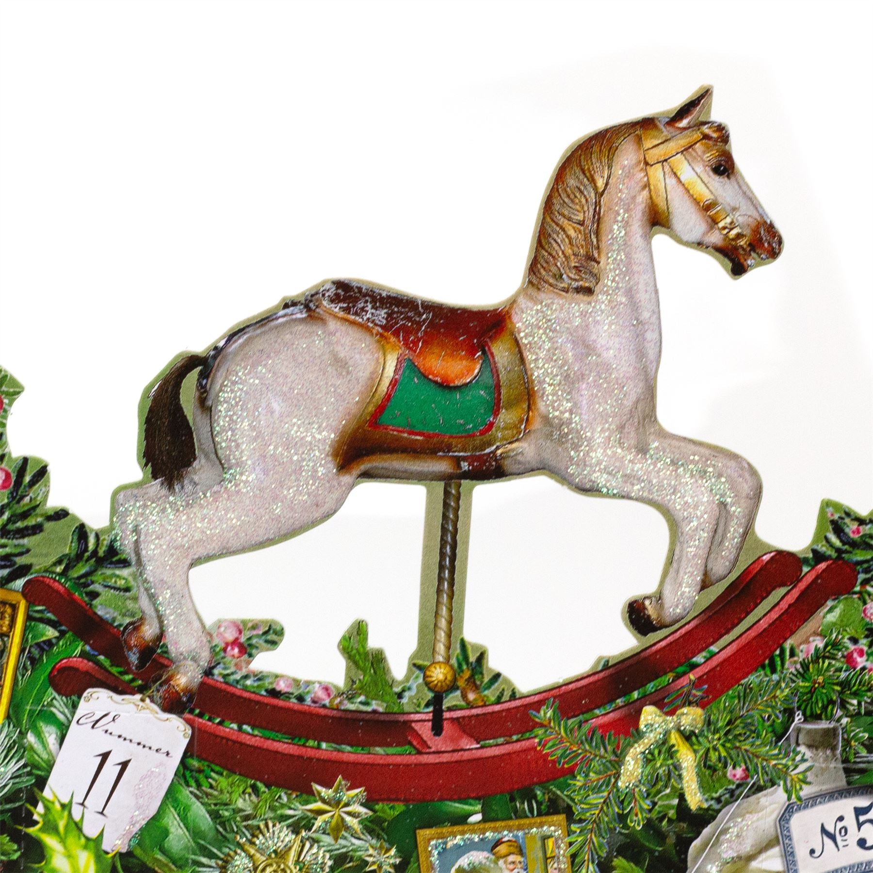 CLASSIC DESIGN WITH SPARKLE | Features delightful vintage-style illustrations, holly leaves, golden bells, and a rocking horse, all finished with a dusting of glitter