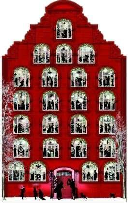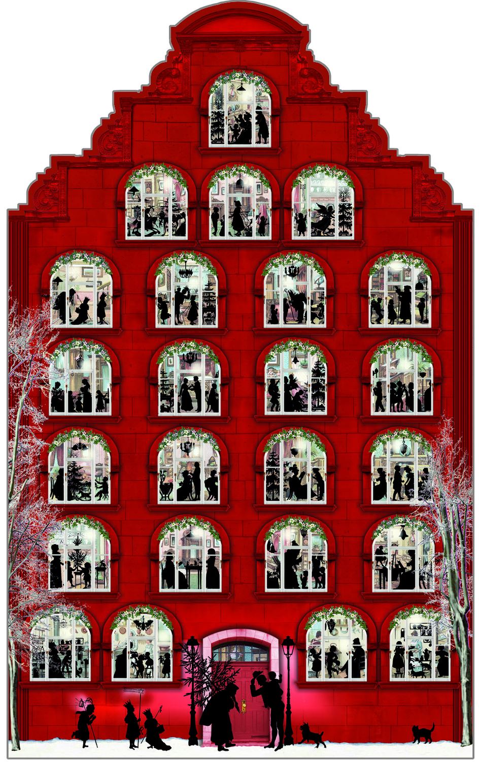 A beautifully illustrated Advent calendar featuring a Victorian house at Christmas