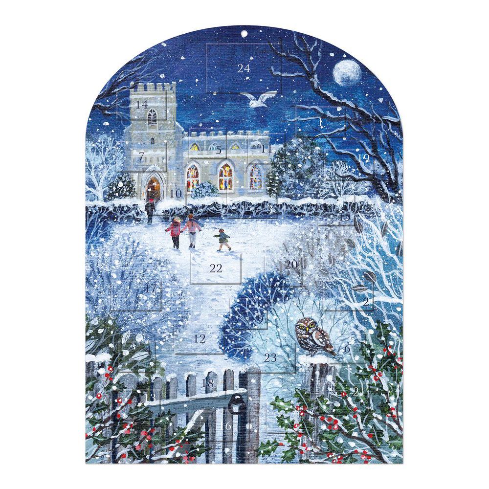 Countdown to Christmas with this traditional advent calendar, featuring 24 windows of a snowy village scene with a glowing church, falling snow, and festive charm