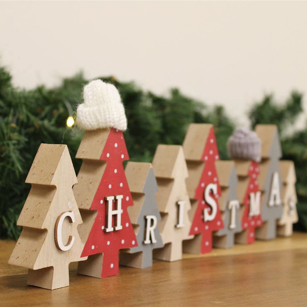 Bring joy to your home this holiday season with our enchanting Christmas word block, featuring a row of Christmas trees, each showcasing a letter that spells "Christmas." Two of the trees are topped with cosy woolly hats, adding a playful flair that will make your festive decor truly stand out
